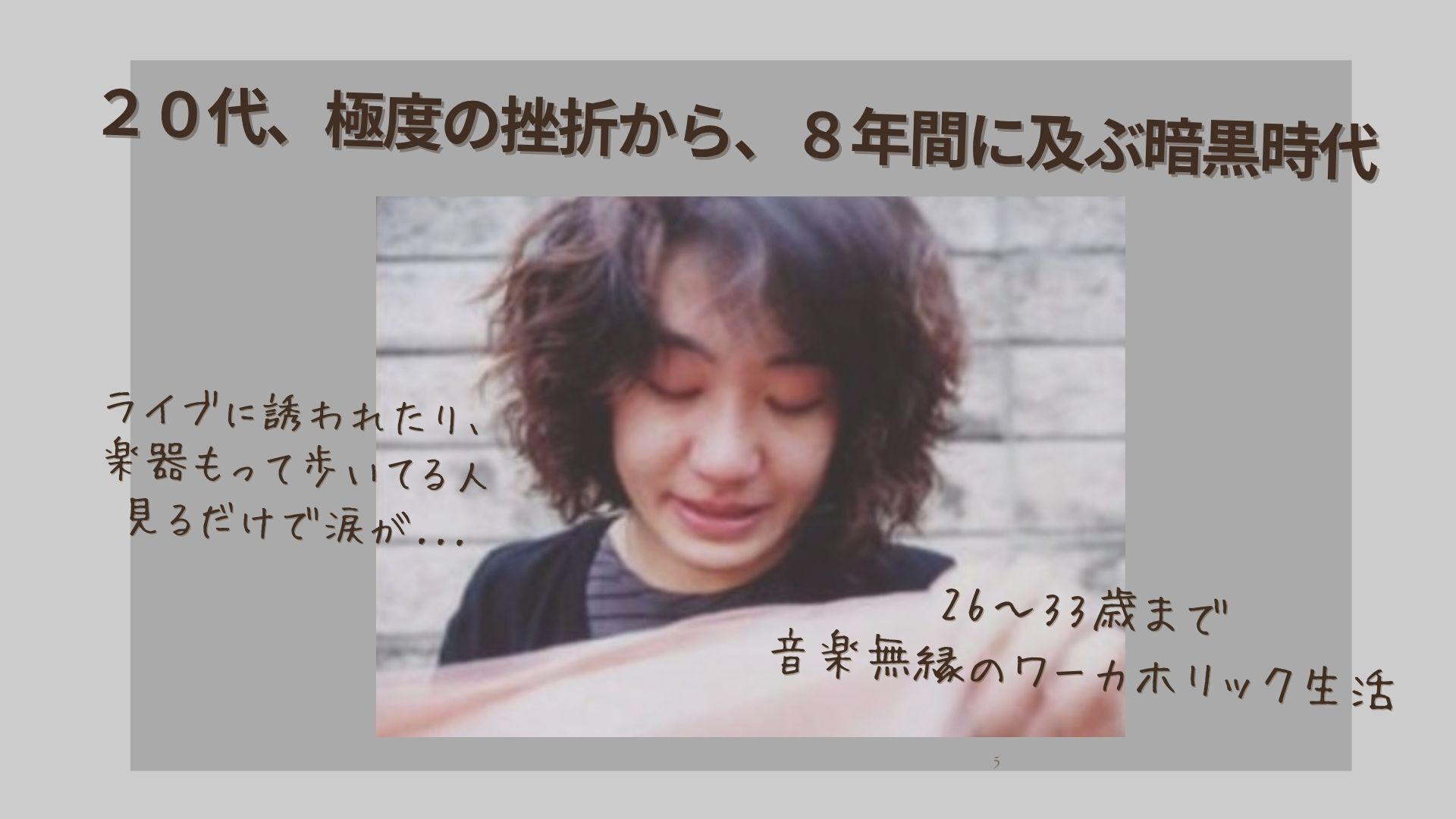 音楽を聴くことすらつらく、ギターを持って歩く人を見かけるだけで胸が締めつけられ、涙がこぼれそうになる。路上ミュージシャンを避けるように、思わず回り道をしている自分がいました。
