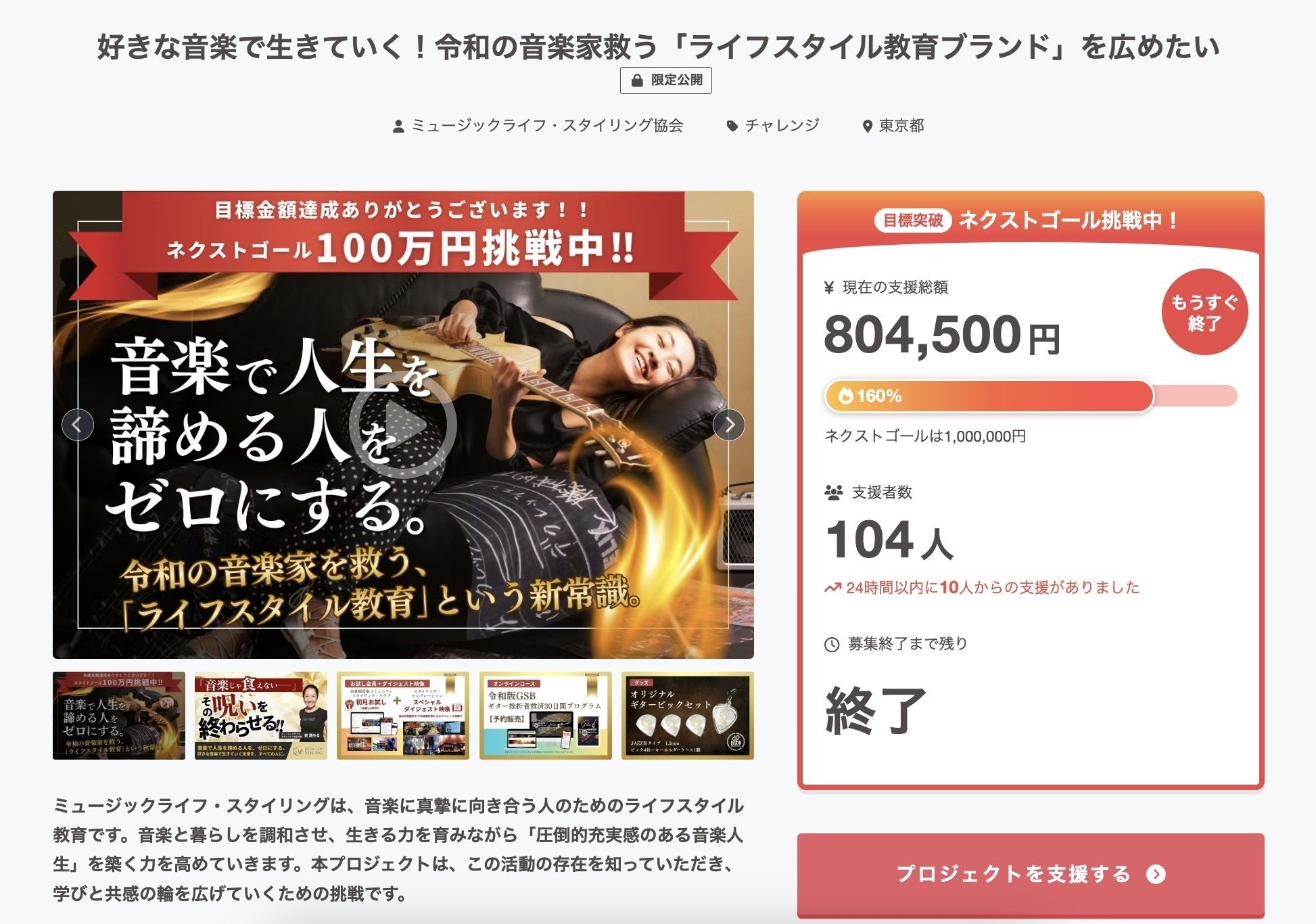 2025/12/13 18:37皆様、12/12(金)23:59をもちまして、クラウドファンディングが終了しました!104名の方々から、ファーストゴールの160%となる804,500円の支援金額を集めることができました。ご支援いただきました皆さま、ご協力くださった皆さまに心より御礼申し上げます。この28日間、クラファンやっていなければ出会いようのなかったような方々と次々とめぐりあうことができました。個人&企業サポーターの方々のお名前はこちらに掲載させていただいています。MLSクラウドファンディング プロジェクト サポーター一覧これから関わってくださったお一人おひとりに感謝の気持ちをお伝えしながらリターンの制作、提供準備に入りますので、お届けまで今しばらくお待ちください。まずは終了直後のご報告とさせていただきます。スタートラインに立ち眺めるのは...お待ちいただく間に、ぜひこの曲をお聴きください。スタートラインという象徴的なナンバーです。 2011年にギター挫折者救済30日間プログラムを受講された北九州のアーティスト、池端克章さんの新作です!クラファンが終わり、ここからがスタートライン...またすぐにお会いしましょう!一般社団法人ミュージックライフ・スタイリング協会代表理事 笑 満ちる拝プロジェクトチーム一同 もっと見る