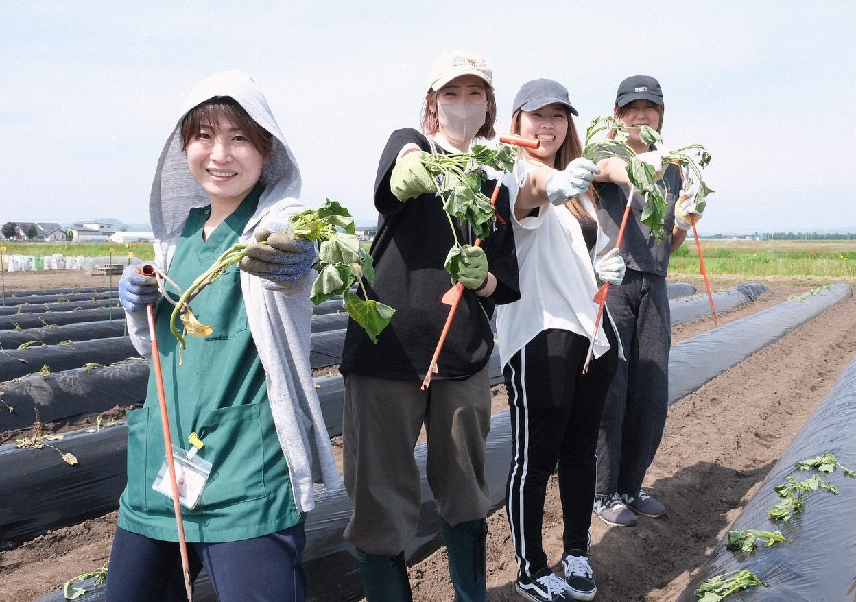 地元JAのサツマイモ部会は市民向けの「10株オーナー制度」をされていますが、2025年はこれに関連して、旭川を拠点とする動物病院グループの皆さんにも体験いただき、大好評となりました。普段は別の病院で働いている人同士が畑で同じ作業をすると、仕事の時とは違った話が弾みます。