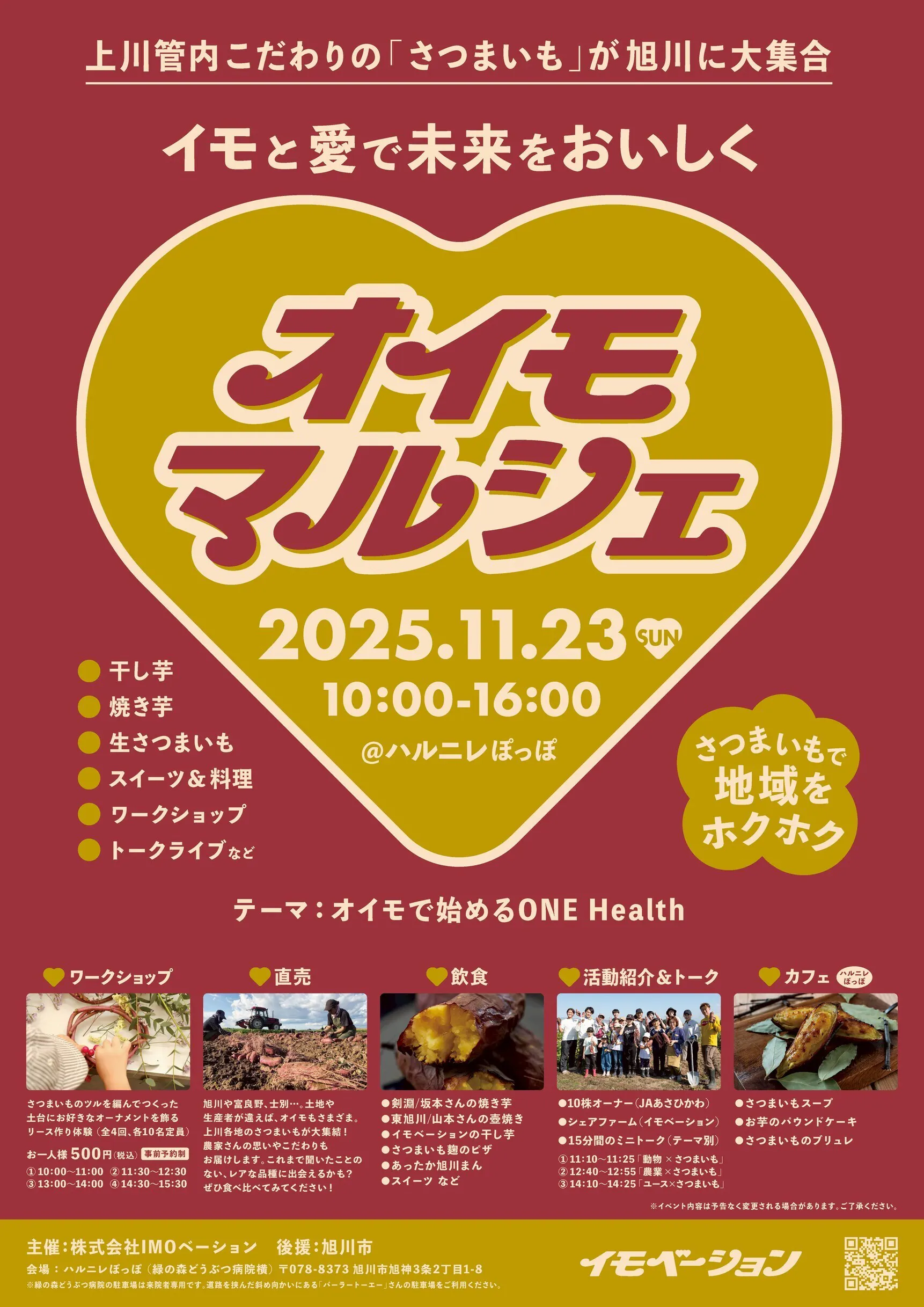 2025/11/22 23:59本クラウドファンディングでも軽く触れた「オイモマルシェ」がいよいよ、明日23日に開催されます! ご支援いただいたおかげで、この地域のさつまいも関係者が一堂に会し、生産者と消費者がつながるイベントを開くことができます。ありがとうございます!!オイモマルシェの4つの柱は、【カフェ】【ワークショップ】【直売】【ブース】です!カフェメニューとしては、ハルニぽっぽオリジナルのスープ・パウンドケーキ・ブリュレ・パフェが楽しめます。スタッフの方が自ら育てた、永山のオイモです!ワークショップは、「シェアファーム」で収穫させてもらったツルで編んだリースの土台に、いろんな飾りを付けていきます。なんと、旭川家具のこっぱや端切れもご用意。ここだけ、あなただけのリースを作れます!直売は、上川管内の4農家さんのさつまいもが勢ぞろい。当初アナウンスしていた7農家さんからは減ってしまいましたが、その分しっかり魅力をお伝えしていけるかと思います!ブースとしては、剣淵町の道の駅で人気の焼き芋、東旭川の壺焼き「いも&」さん、旭川農業高校のプリンと中華まん「あったか旭川まん」、旭川北高校の生徒さんと一緒に考えた「さつまいも麹ピザ」、イモベーションの燻製干し芋(ワンちゃん用あり)があります。ほかにもトークライブや、マル秘おいもグッズのお披露目、じわじわ人気のイモベーショングッズ販売なんかもやりますよーーっ!いずれも数に限りがありますので、売り切れにご注意ください!イベント慣れしていない私は、今からドキドキ。きっとたくさんご迷惑をおかけするのですが、それ以上にいろんな出会いや感動、おいしさがあって、明日の今ごろ、大満足しているのは間違いないのです====== ====== ======会場のハルニレぽっぽ(旭川市旭神3条2丁目1-8)は、どうぶつと自然のそばで過ごせるOne Healthケアガーデンです。どうぶつたちが日常的に行き来する空間のため、ご体質やご事情により配慮が必要な方は、その点をご確認のうえご参加をご検討ください。====== ====== ======駐車場は来院者専用です。オイモマルシェにお越しの方は、画像にあります通り、パチンコ店「パーラートーエー緑が丘店」さんにお願いします。 もっと見る