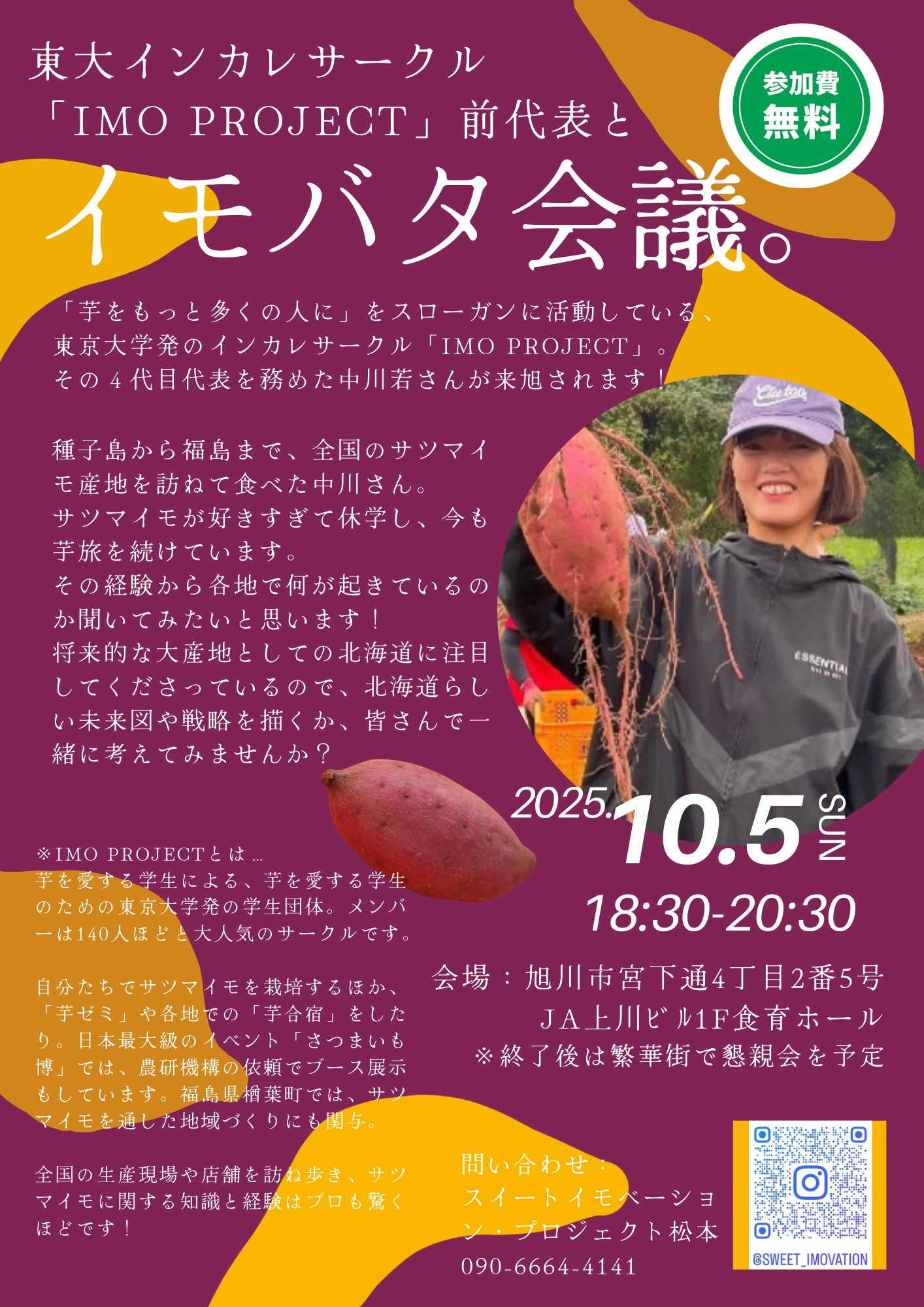 私は新聞記者をやめて北の大地に移住し、地域に溶け込んだ「旭川公園ゲストハウス」を運営したり、ライターをしたりしています。農家さんたちと交流する中で3年ほど前からサツマイモに注目し、ひょんなことから運命を感じて、「人生の後半戦は、イモベーションをする人になろう!」と決意しました。イモベーションをネットリ広めて、地域をホクホクさせることを目指しています🍠