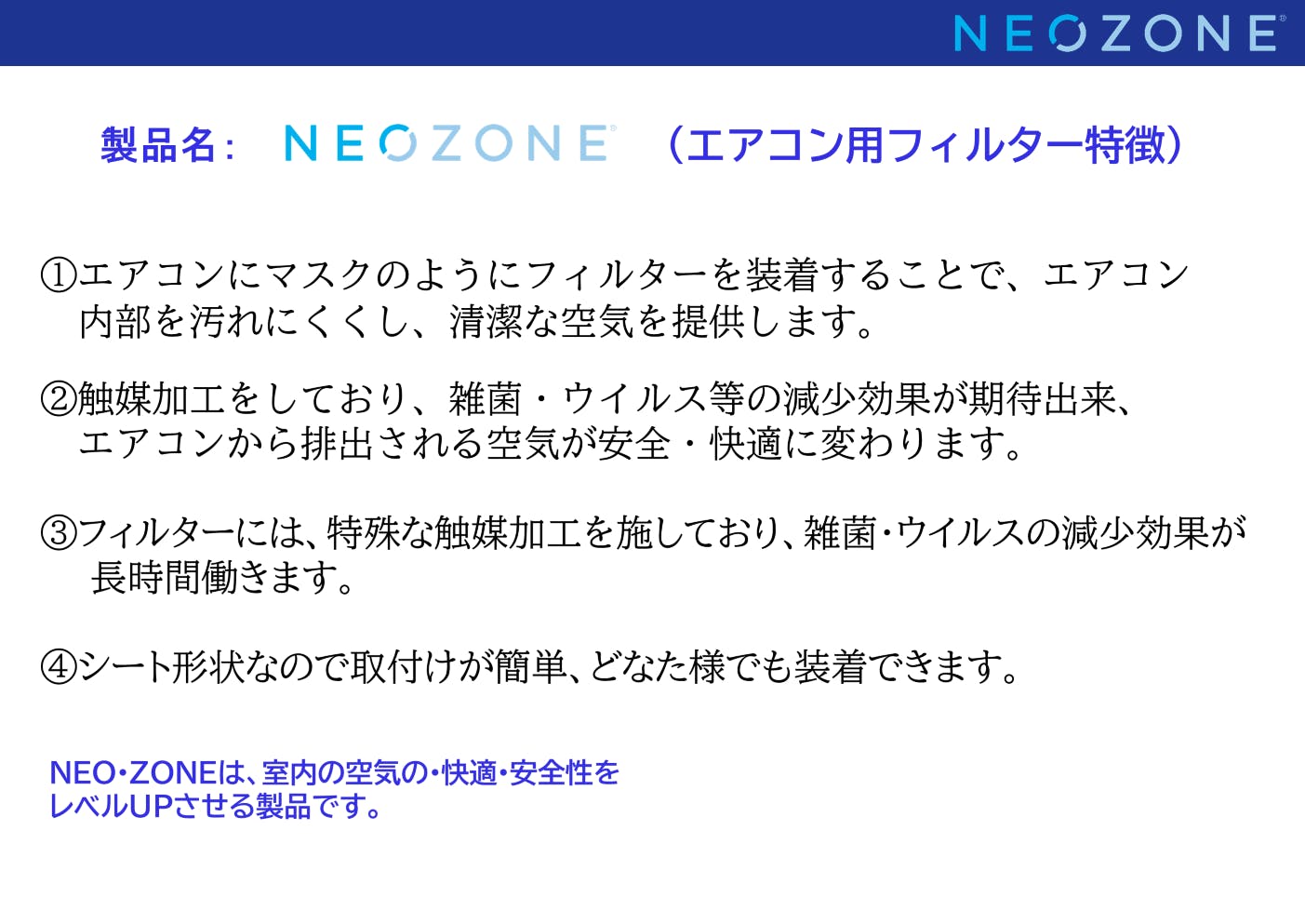 NEO・ZONE®フィルターは簡単に取り付けて使用が出来るので、一般のユーザー様に認知して頂きたくて、紹介を致します。 このNEO・ZONE®フィルターを使用する事により、 室内の有害な菌・ウィルスを抑制し綺麗な空気を循環させることで、安⼼で清潔な室内空間を作り、クリーンで安全な環境を提供致します。
