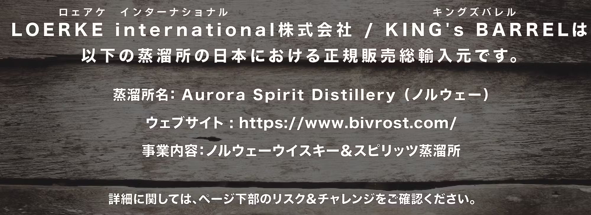 ドイツと北欧のウイスキーとスピリッツの美味しさと各蒸溜所が持つ素晴らしい物語に惚れ込んで、日本ではまだ知られていないハイクオリティで美味しいお酒を取扱うLOERKE international株式会社は、KING's BARREL(キングズバレル)という名前で、未知の美味しいお酒が待つ世界への扉として、日本に住むすべての皆さんと一緒にその扉を開いて美味しいお酒を探求する旅に出かけようというコンセプトのもと、独自に選び抜いた自らが美味しいと思ったお酒のみを各蒸溜所/メーカーより直輸入し、2020年より日本総輸入元として蒸溜所と二人三脚で国内での卸と小売を行っています。