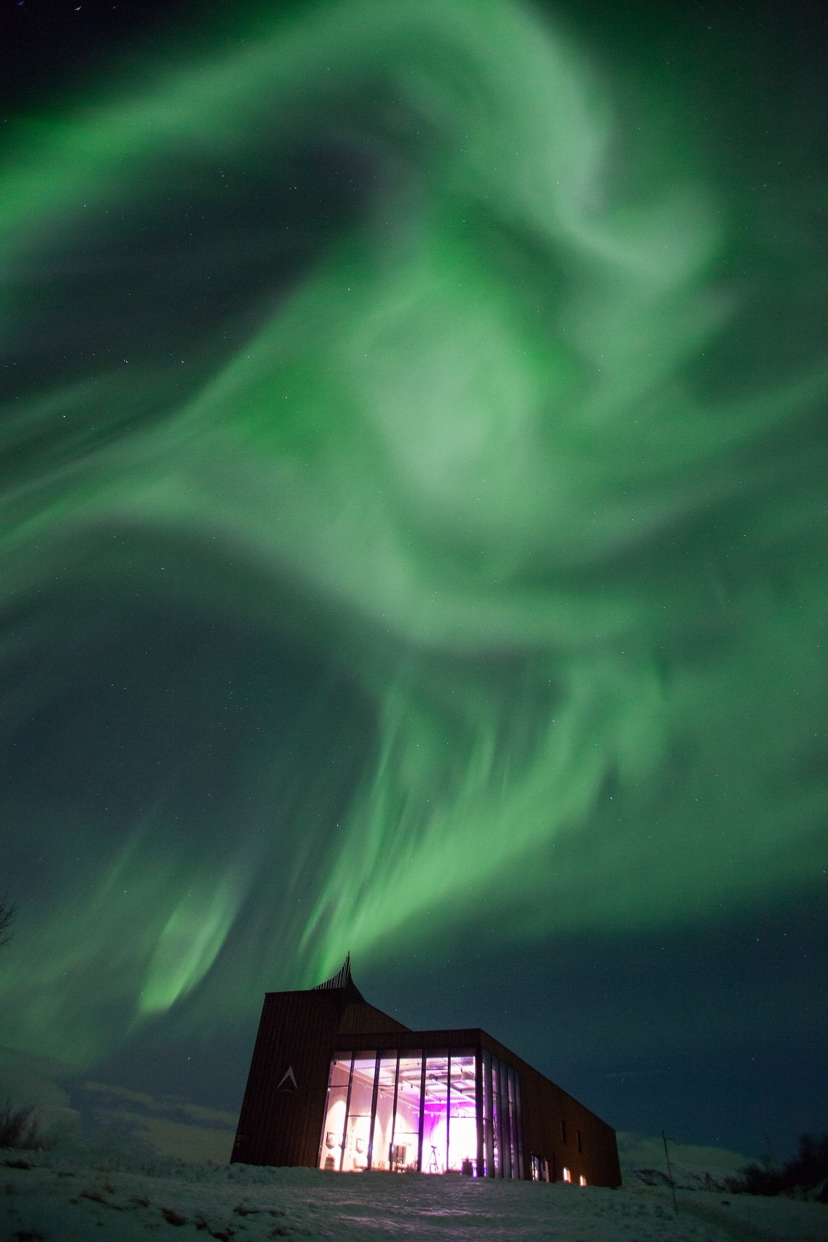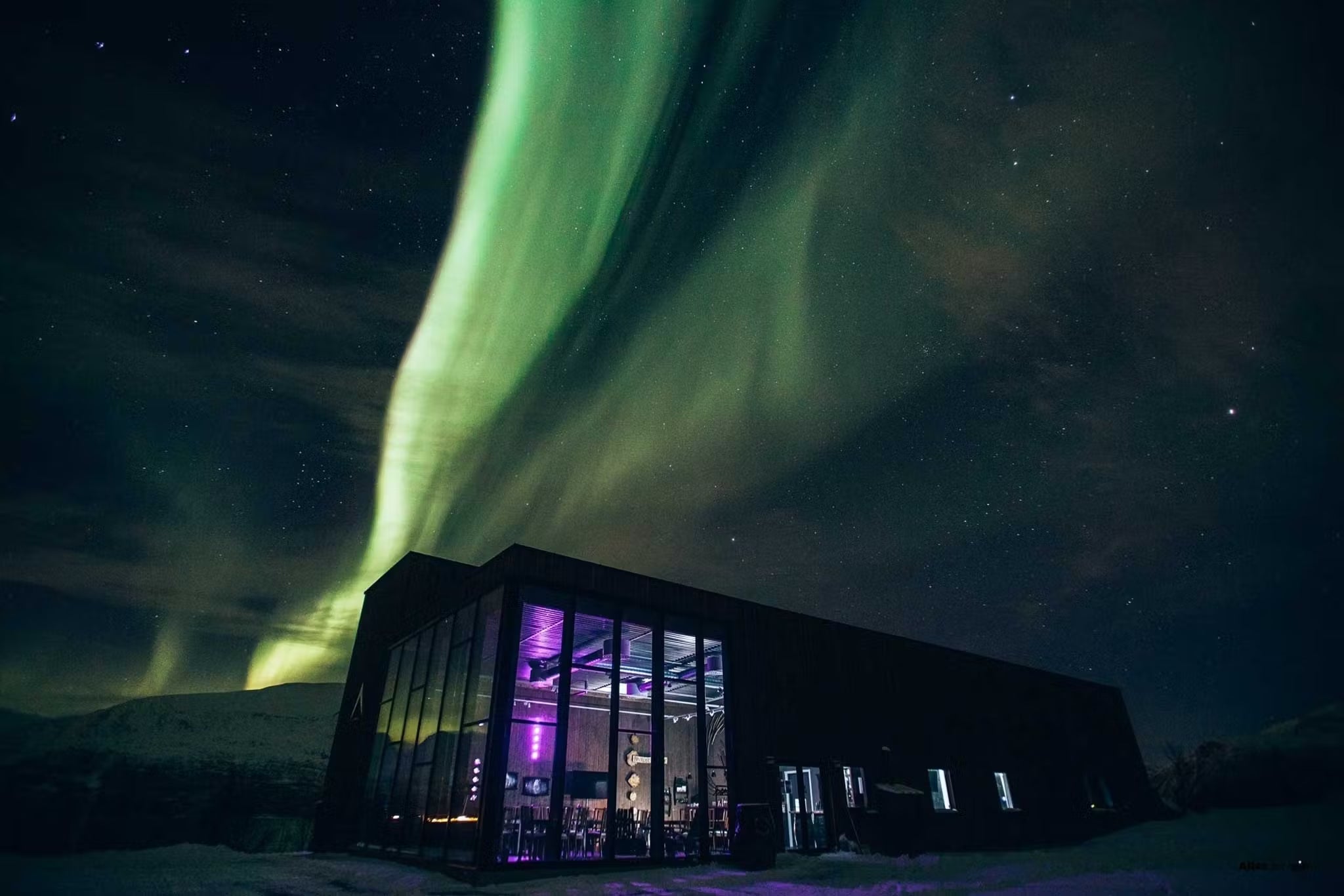 オーロラに包まれる蒸溜所日常とかけ離れたその広大な美しい景色と夢のようなオーロラで有名なこの土地には毎年多くの観光客が世界中から訪れ、その異次元の世界のような神秘的な光景を目の当たりにし感動に包まれる。