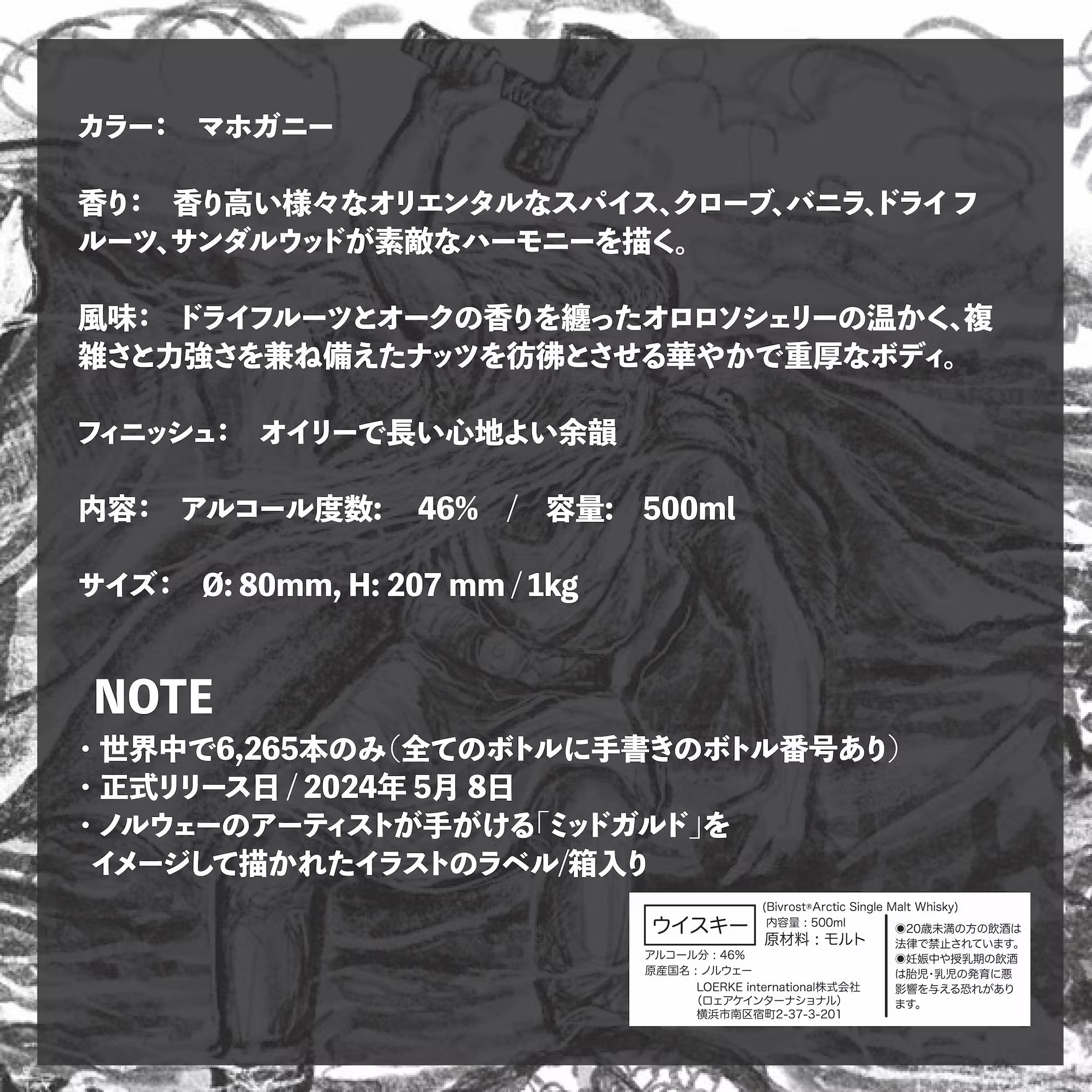 そんなミッドガルドをイメージしつくられた、シリーズ最終作の9番目となる「ミッドガルド」は氷のように冷たい大地、ノルウェーの北極圏で氷河の融解水と北欧大麦から作られ、ハイテク蒸溜器で蒸溜された後、選び抜かれた様々な種類のオロロソシェリー樽で4〜5年熟成され、重厚なボディ、オークのスパイスとドライフルーツの甘さが絡み合う奥深く複雑な風味を持つクラシックなシングルモルトウイスキーへと仕上がっている。