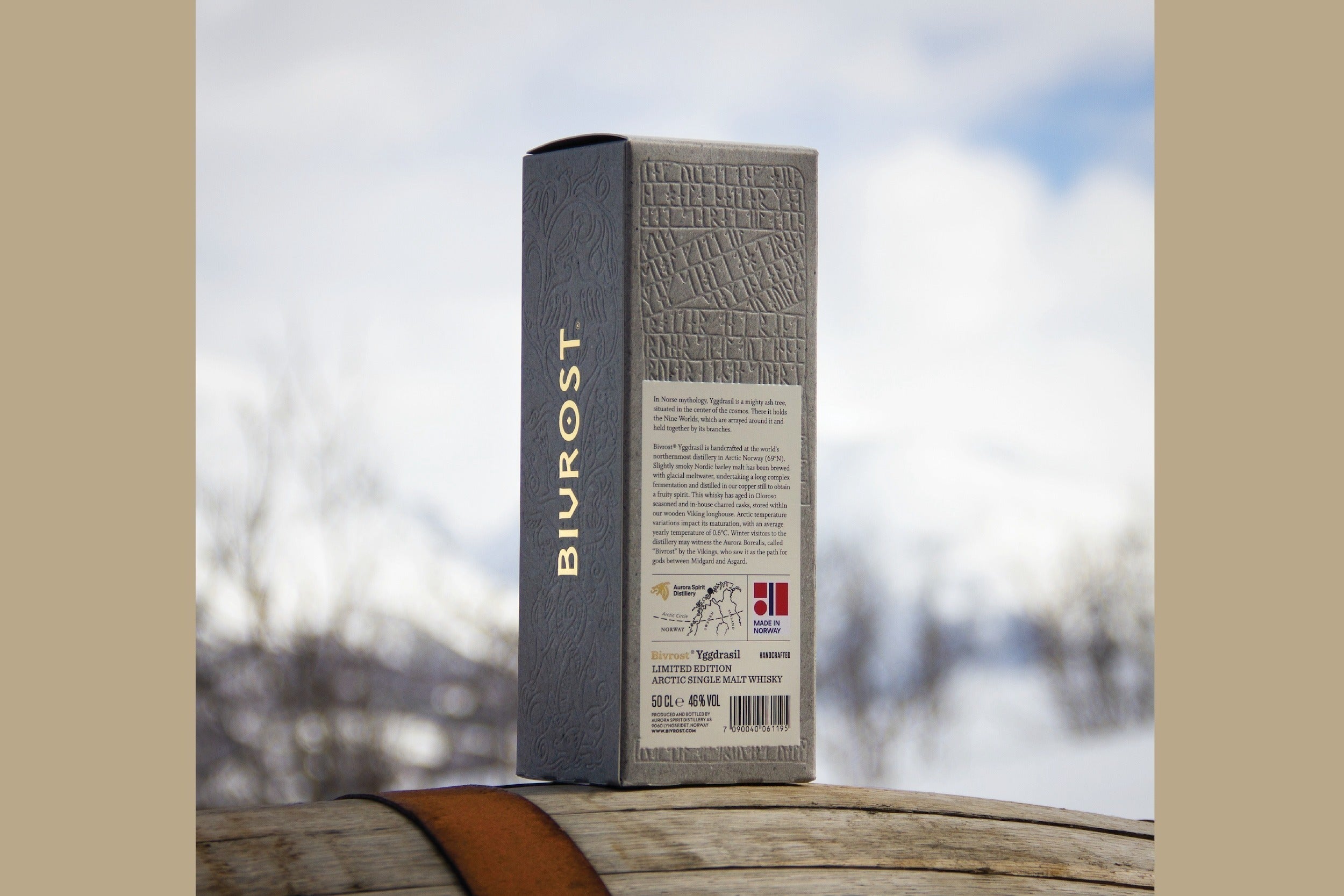 北欧神話の9つの世界を包括する世界樹「ユグドラシル」をテーマにつくられた北極シングルモルトウイスキーの専用箱には古いヴァイキングの文字である「ルーン文字」でユグドラシルの物語が綴られている。