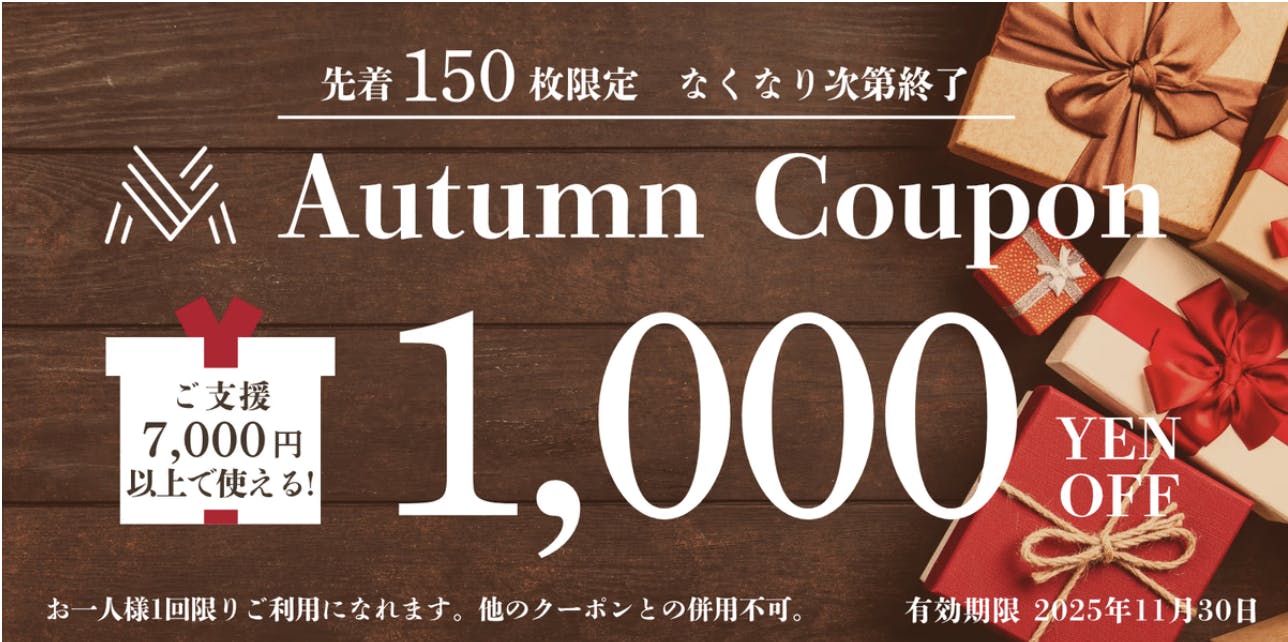 このクーポンは当プロジェクトを含む11月末までのmachi-yaのプロジェクト全てにおひとりさま1回限りで使用できるクーポンのようで先着150枚限定のようです!