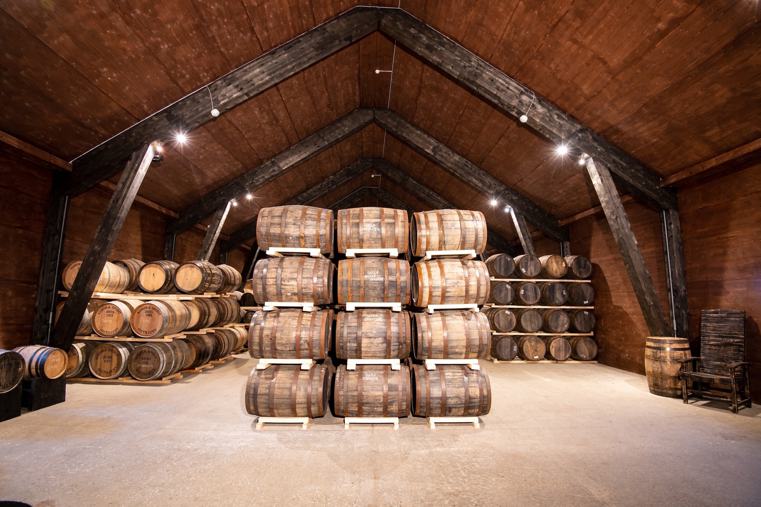 暑い日には樽内の圧力が高まって膨張し、酒が樽の奥深くまで浸透する。 逆に気温が下がると酒に樽の風味がより染み込むという、スピリッツと樽のこういった相互作用は樽の熟成に欠かせない大切な要素だ。さらに、比較的小規模な蒸溜所である「オーロラ・スピリット」では、通常に比べ小さめの樽を使用しており、大きな樽と比べ、小さな樽の中では酒が樽に接する割合がその分増え、その結果、ウイスキーの個性がより早く形成され、樽由来の香りや風味がより色濃く押し出されるのだ。