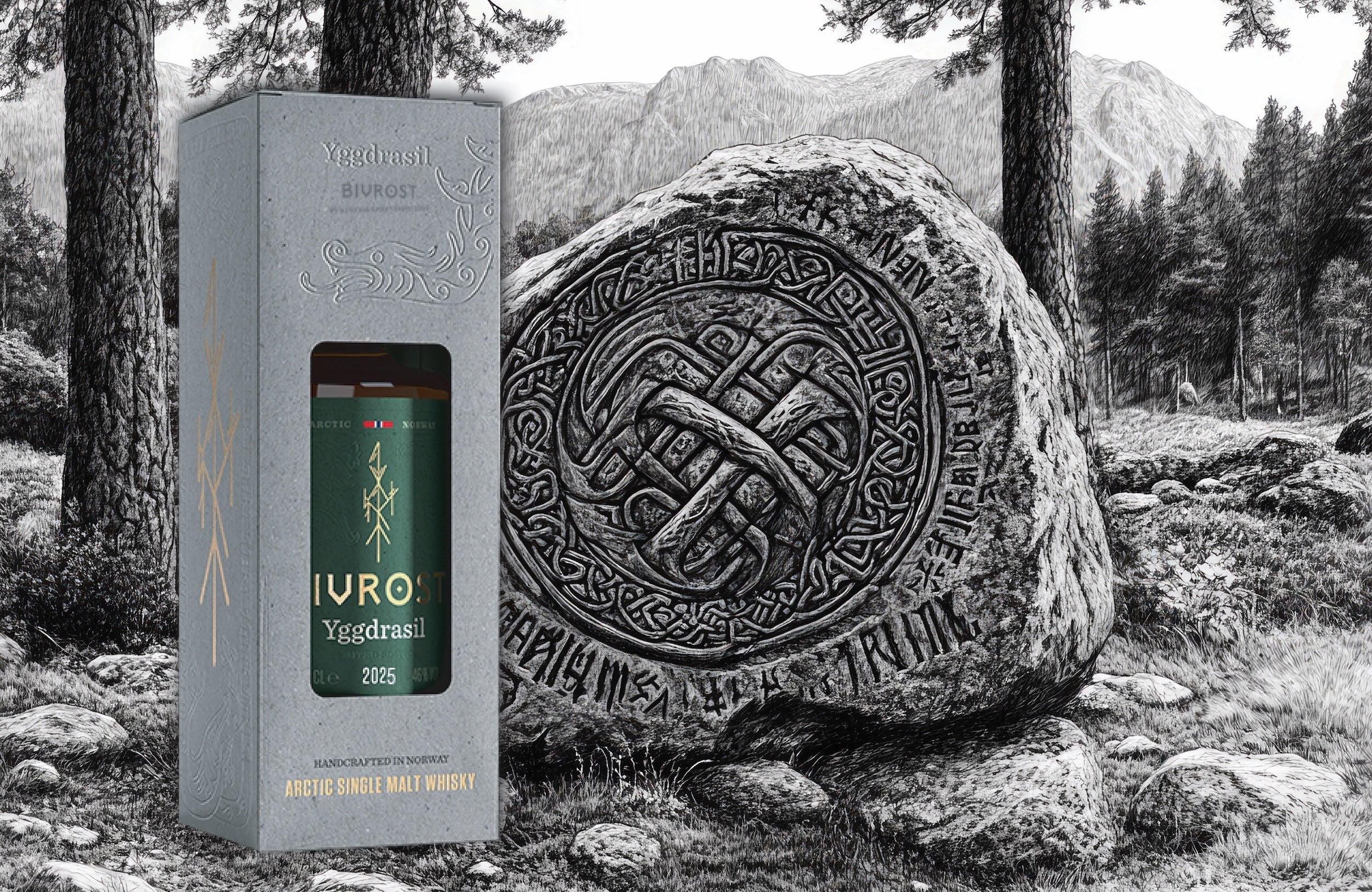 その昔、北の民ヴァイキングたちの伝統として、偉人や重要な出来事を偲び、ルーン文字を刻んだ石碑を建てていたという。そんな偉大なる祖先に倣いヴァイキングの末裔たちがつくった世界最北端のウイスキー「ユグドラシル」は、石碑をイメージしたストーン調の土台にエンボスでルーン文字が刻まれた美しく印象的な箱に収まっており、実際にルーン文字で刻まれている内容はユグドラシルの現代の物語だという。
