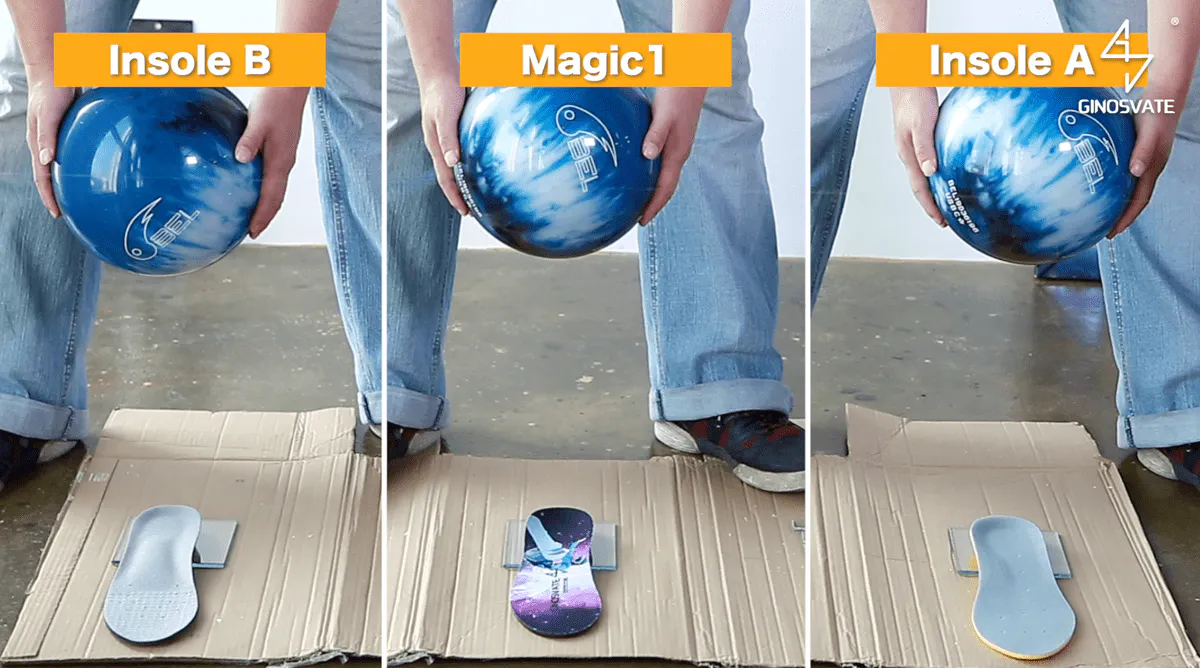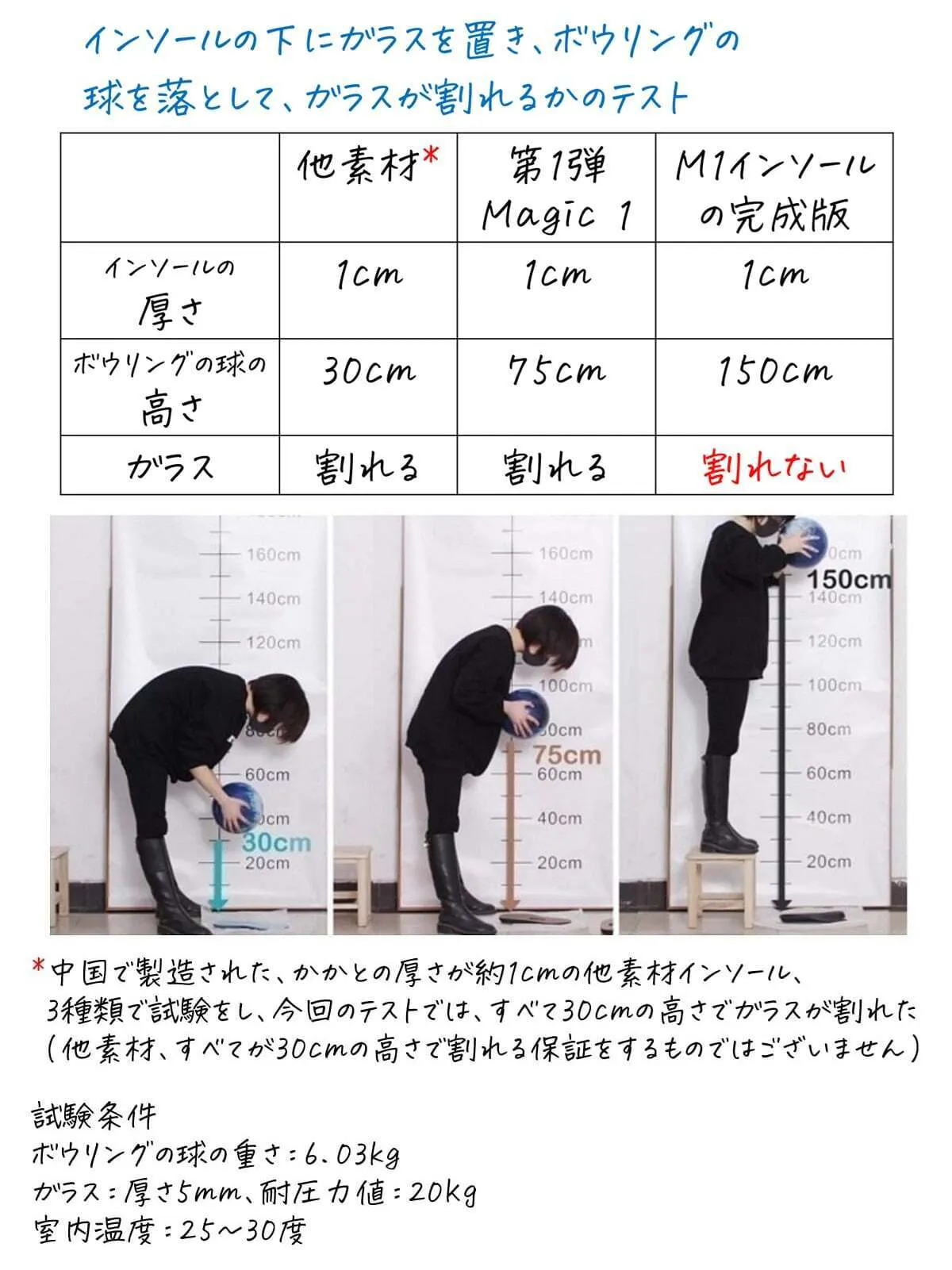 もちろん、最初から一般的なインソールと比べて圧倒的な違いがあったわけではなく、ボウリングの球とガラスを使ったテストでは、同じ高さでのテストからスタートしました。