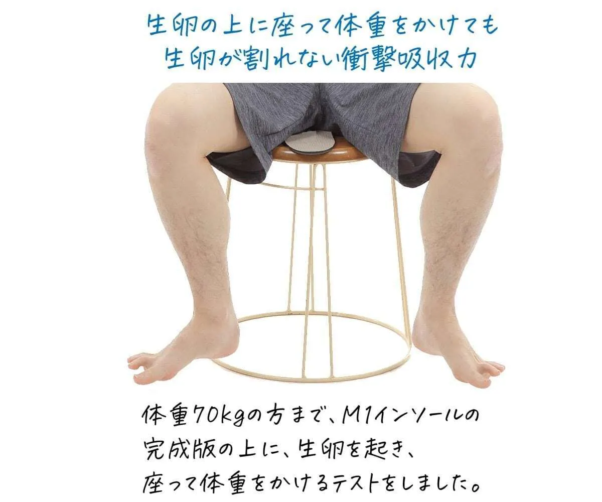 M1インソールは、圧倒的に衝撃吸収力が優れた素材を開発。そして、商品化という手順のため、素材が他のインソールとの1番の違いになっております。