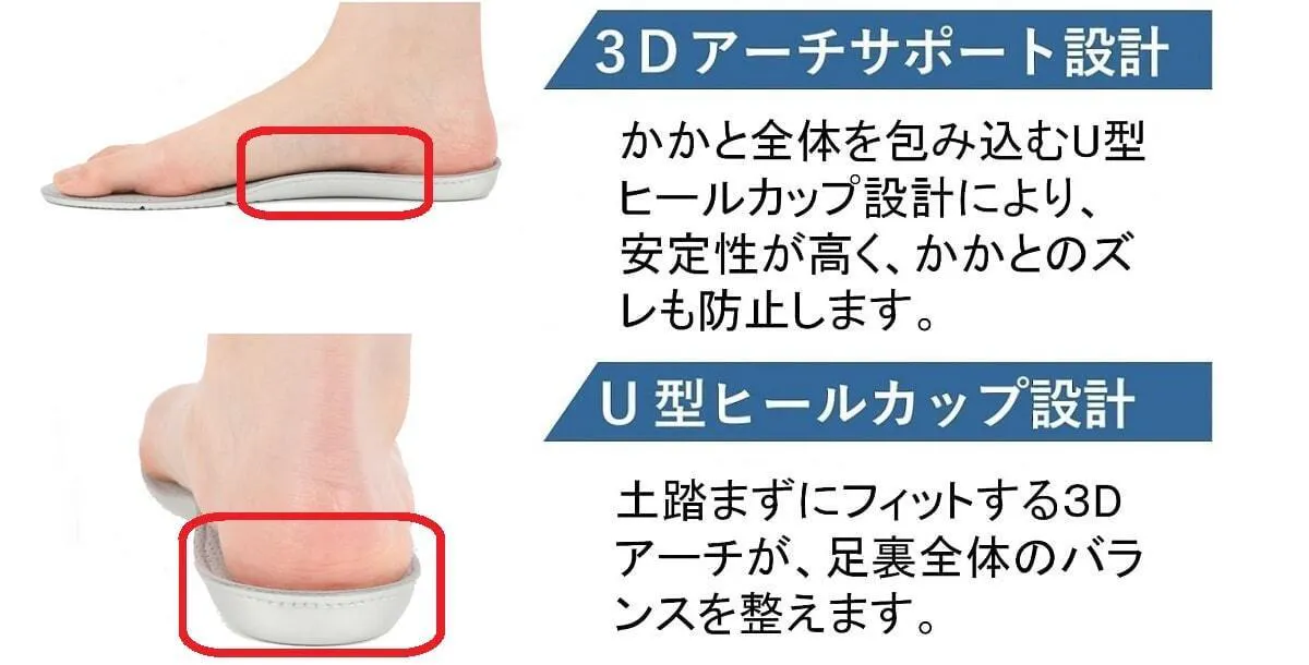 人間工学に基づいた、足にフィットするサポート設計にしています。U型ヒールカップ設計により、踏み込んだ際の衝撃をより軽減します。