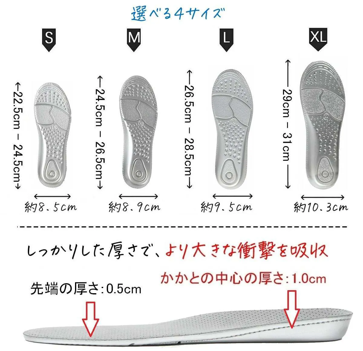 ※インソールは、一般的に厚いほど、衝撃吸収力がアップするため