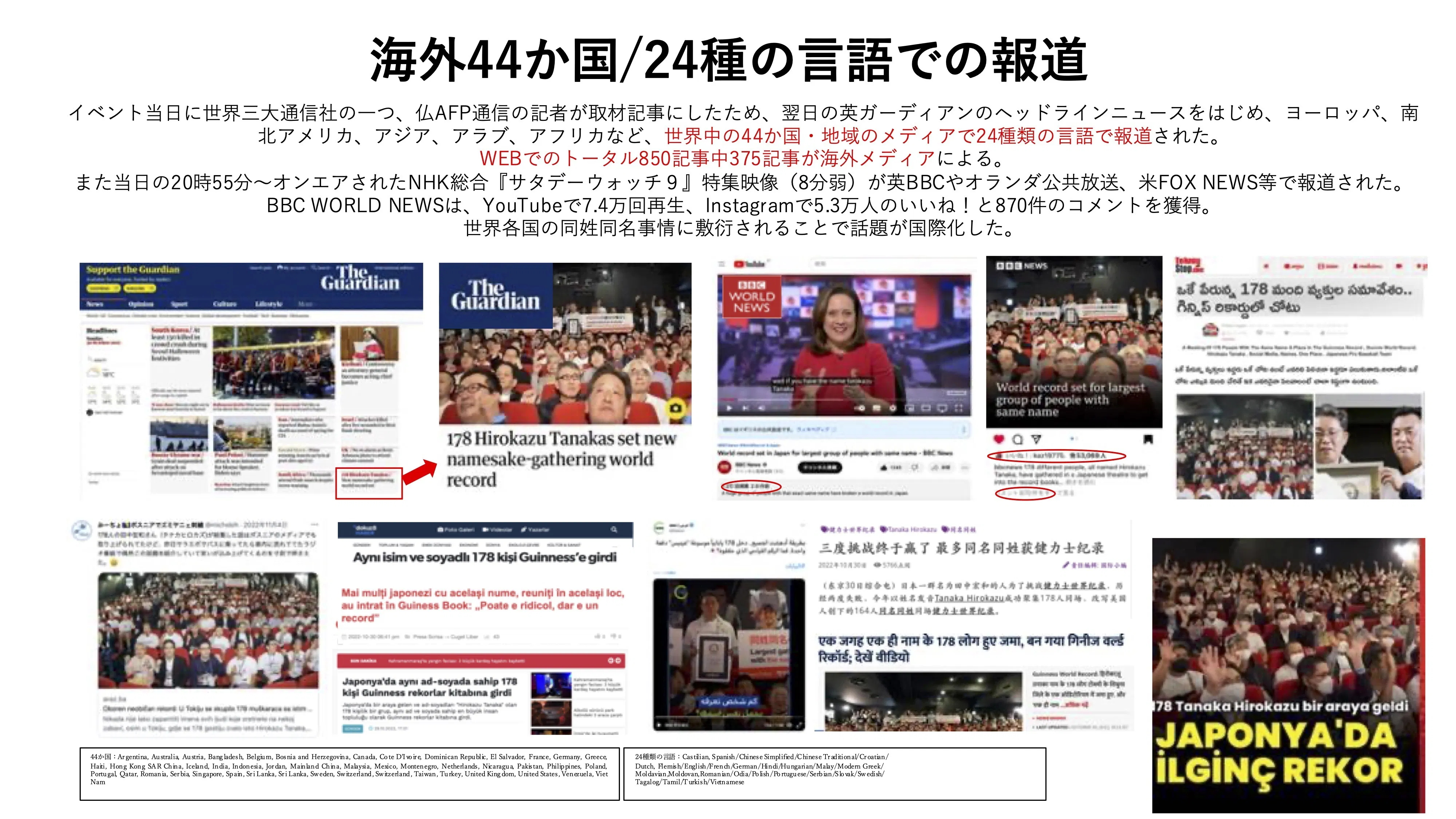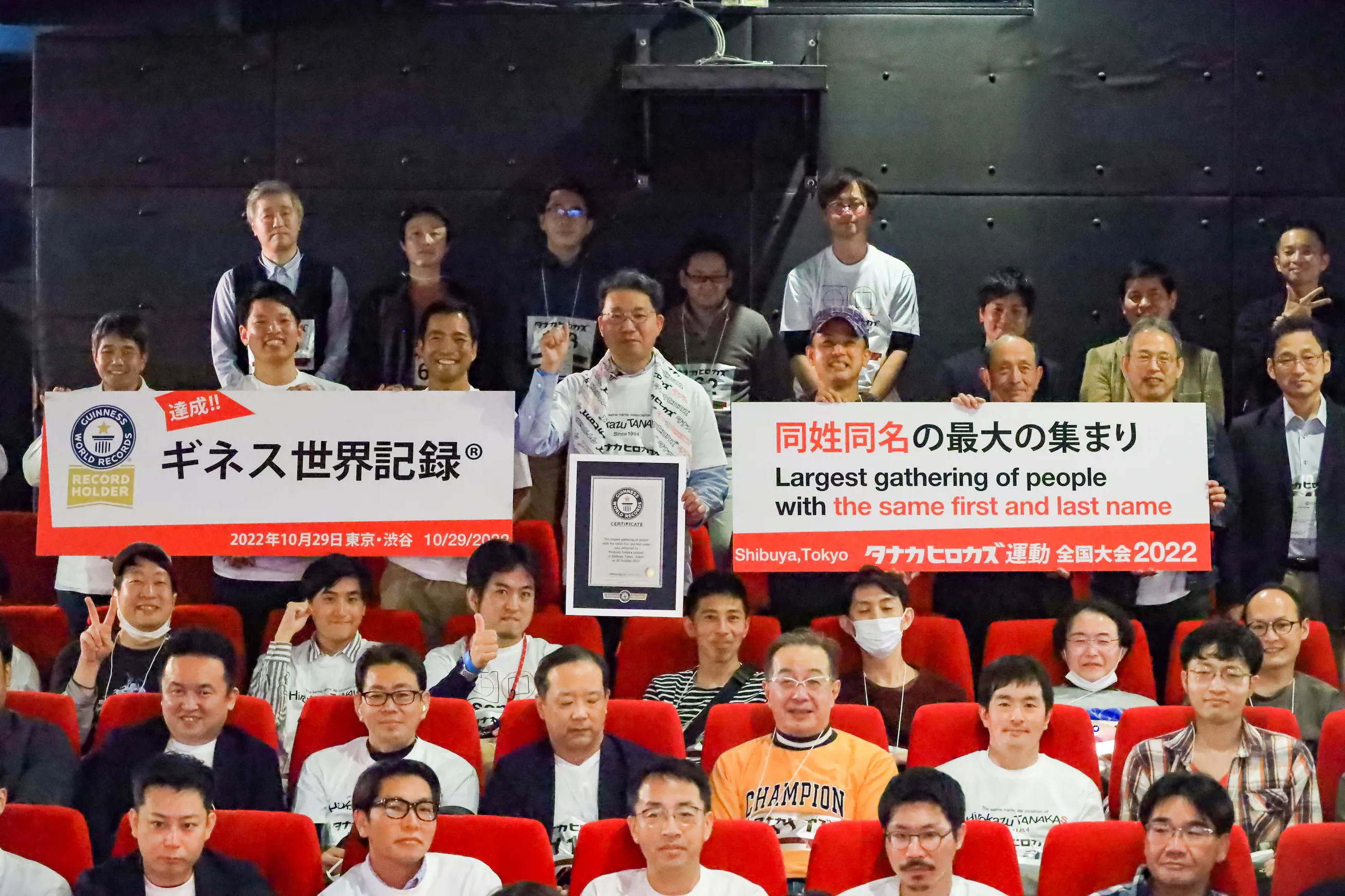 2022年10月29日、アメリカの実業家マーサ・スチュワートさんが持っていた164人の最大の同姓同名の集まりの世界記録に対し、178人のタナカヒロカズの集まりを達成し、更新することができました。結果、思いも寄らないほど世界中の関心を集め、44カ国28種類の言語で国際報道されました。そのうちのBBCニュースを観た、セルビアのロベルト・チョバン氏は「これはたいした記録じゃない! セルビアなら簡単に抜けるぞ」と思ったそうです。