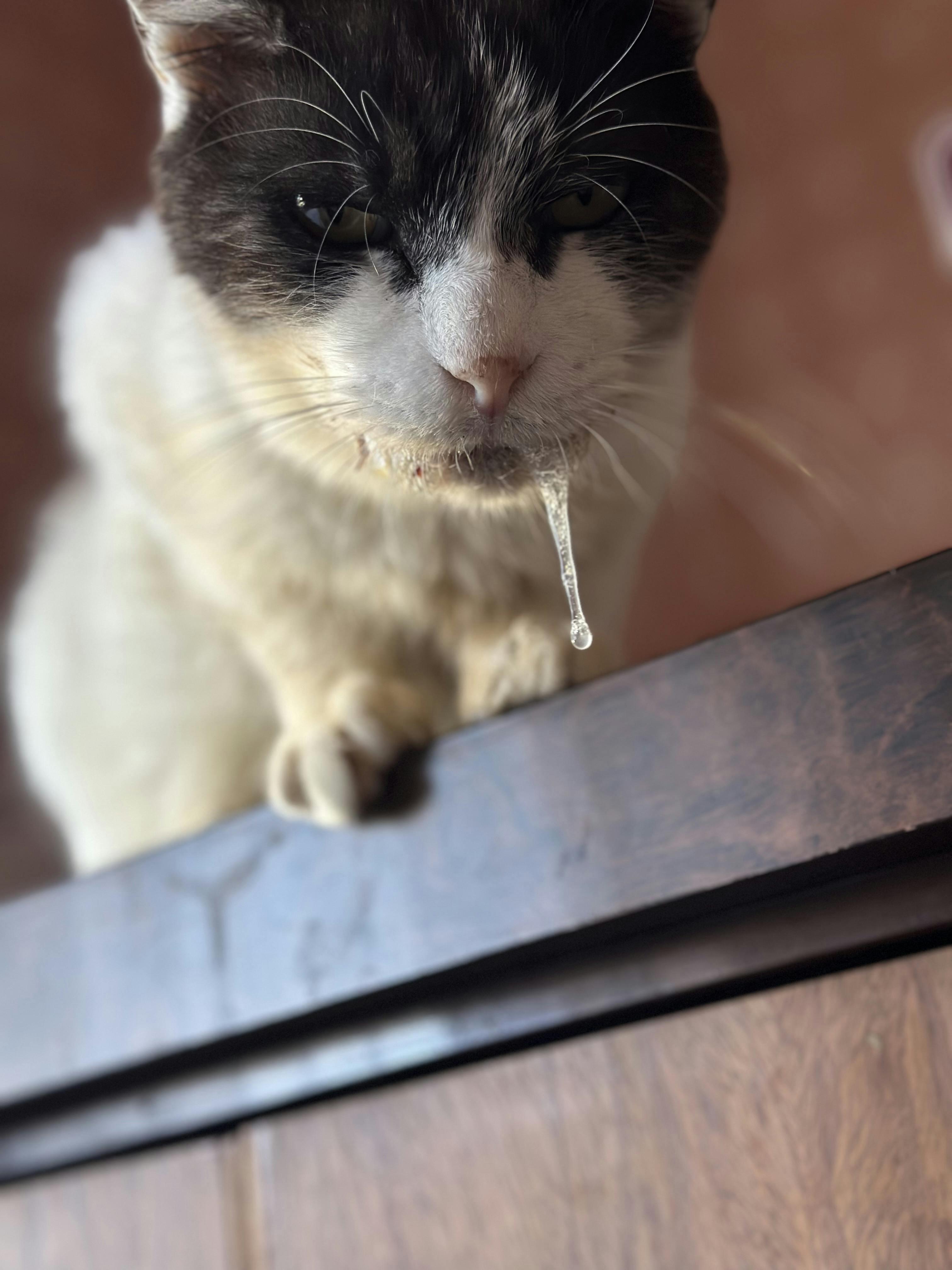 グレー白ちゃんの口からよだれが出ており、口が痛そうなそぶりが見られました。今日はいつもより早めにステロイドを投与し、様子を見ることにしました。
