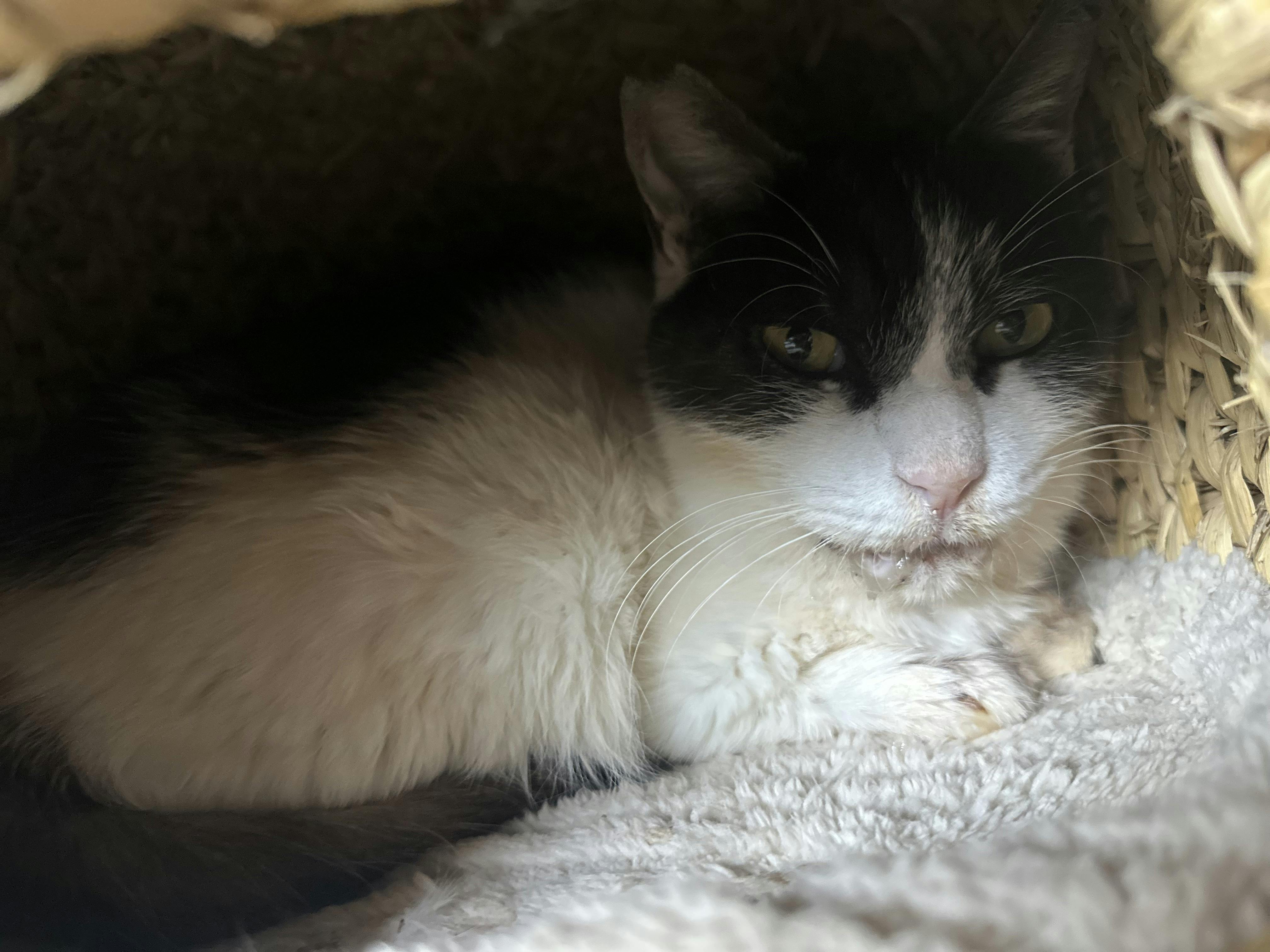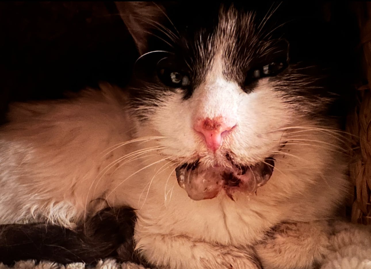 グレー白ちゃん、少し口周りが黒く汚れていたので拭きました。ごはんも朝は食べてくれました。ウェットも食べられる日が続いています。