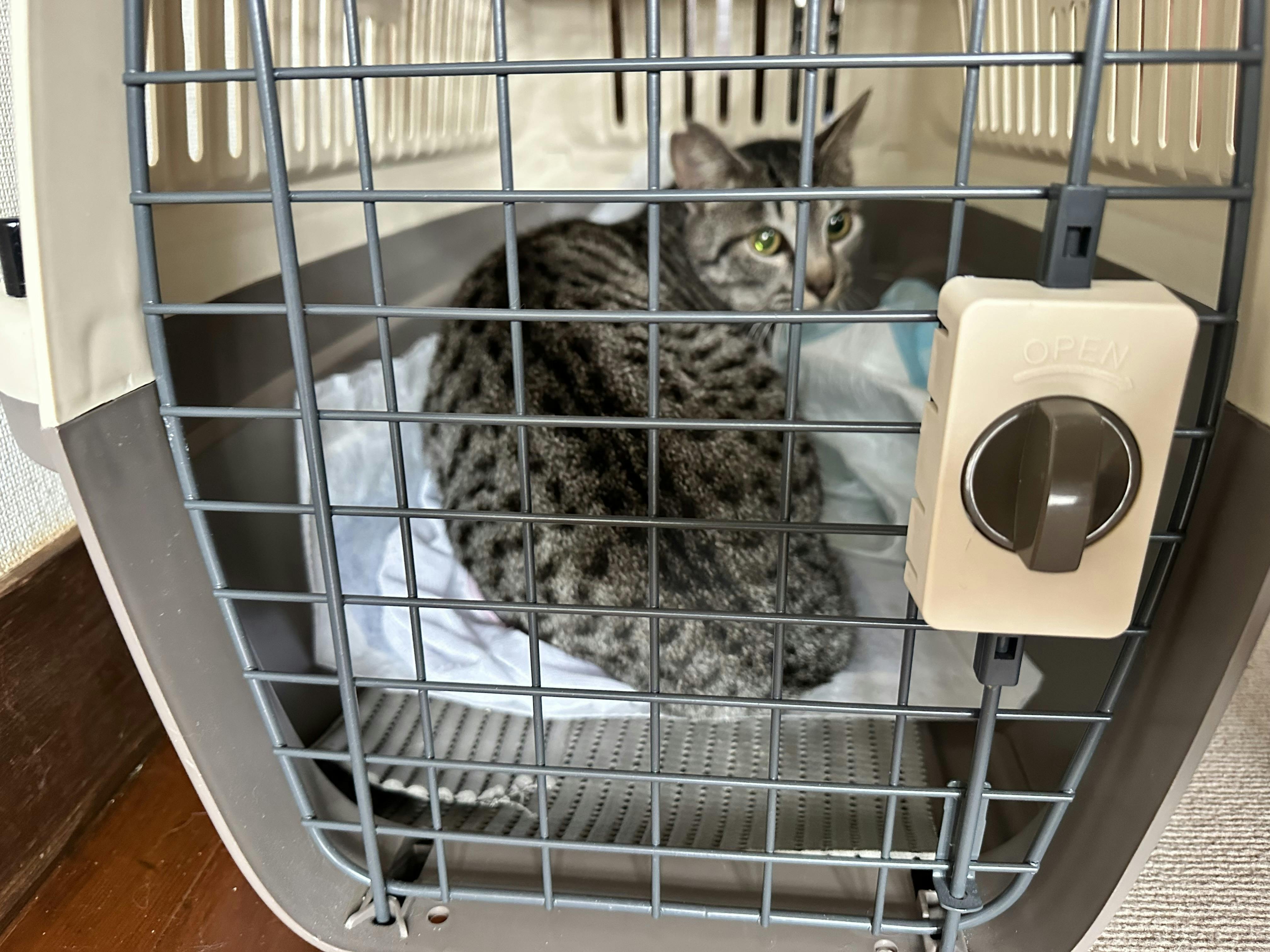 ネットをかけ、上から抱き上げてキャリーに入れましたが、多少の抵抗はあったものの、噛んだり引っ掻いたりすることはなく、キャリーの中でも静かにお利口にしてくれていました。