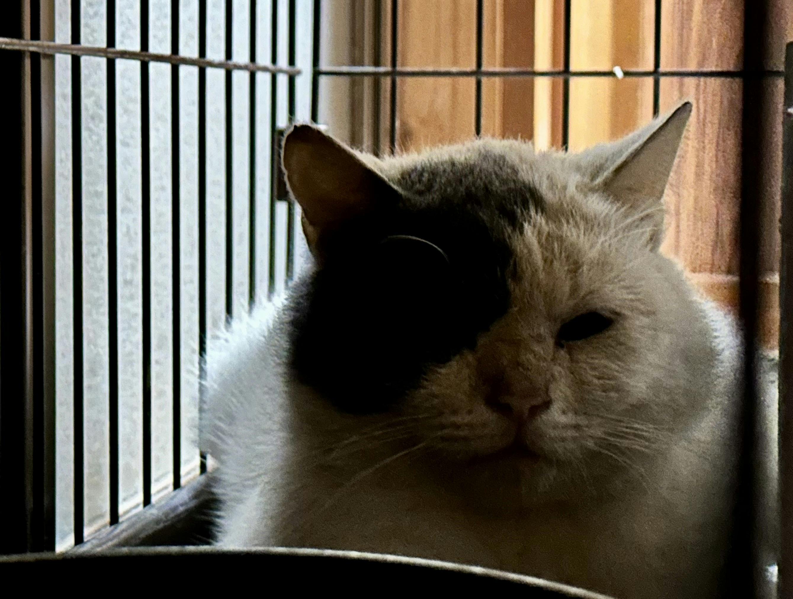 心なしか表情が少し柔らかくなってきた気がします。身体も、煤まみれだったのが少しきれいになったように見えます。今朝は、この毛布の上に体を半分乗せて、ゆったり休んでいました。お皿の出し入れではシャー!と威嚇することもありますが、歯が真っ白で小さいので、まだまだ若い子のようです。汚れや煤で少し老けて見えていたけれど、実際は成猫なりたてではないかなと思います。明日はいよいよ手術です。
