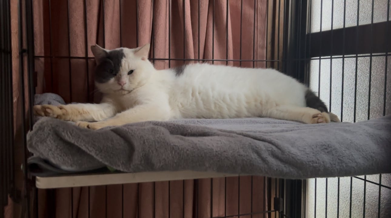 ちょっと体を伸ばしてリラックス。電気ヒーターを敷いてあるのであったかいみたいです。気に入ってくれたようで買ってよかったです。いちばん弱にしているのですが、暑くなるとこちら寄り手前のヒーターのないところで香箱座りしています。