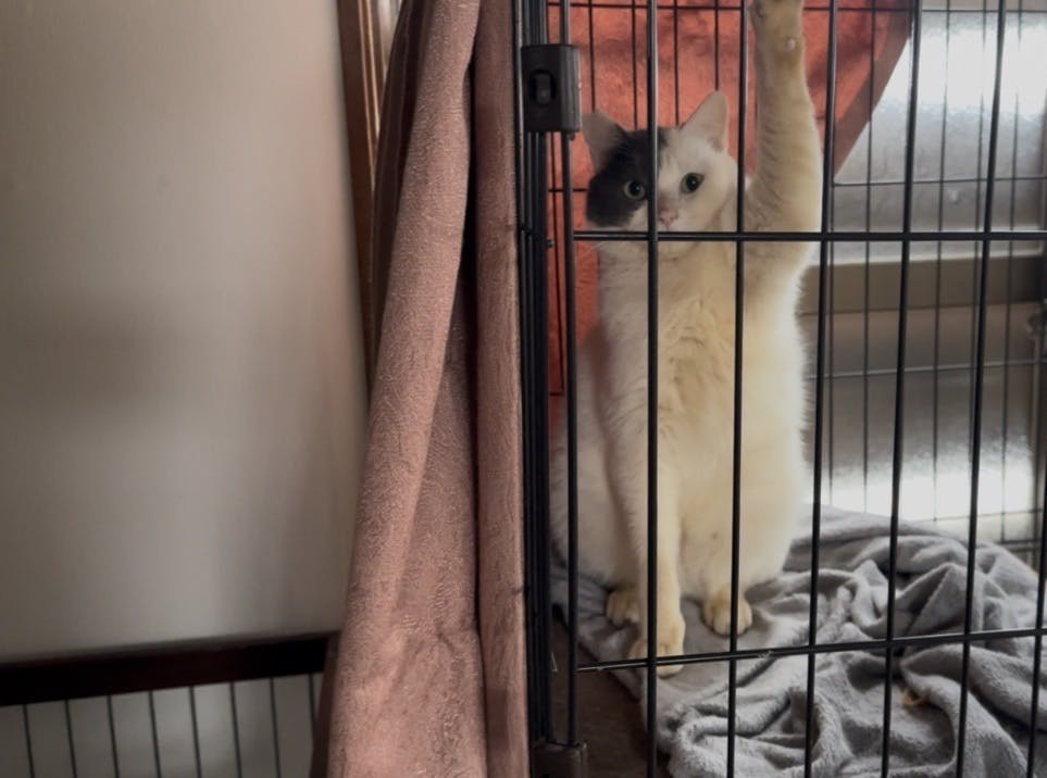 2026/03/15 14:00ん?爪が引っかかってしまった大福。電車の吊り革を持つような姿勢になっています。爪がとても長いので、切ってあげたいのですが、シャーシャーなので難しいのです。本人も脱力して暴れず冷静です。まじまじ見ていると怒られました。また前歯に泡をくっつけています。一度離れることにして、再度戻ると…次は左右の腕が入れ替わっていました。懲りない大福。最終的にはわたしに襲いかかる瞬間に爪は無事外れました。 もっと見る病院へ