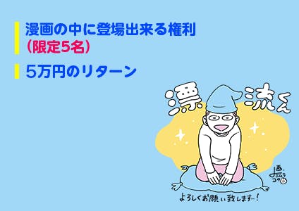 掲題の件ですが、10万円のリターンの内容が、画像上では「漫画の中に登場出来る権利」「1万円のリターン」となっておりましたが、「漫画の中に登場出来る権利」「5万円のリターン」が正確なリターンとなります。この度は混乱を招く表現となってしまい申し訳ありませんでした。