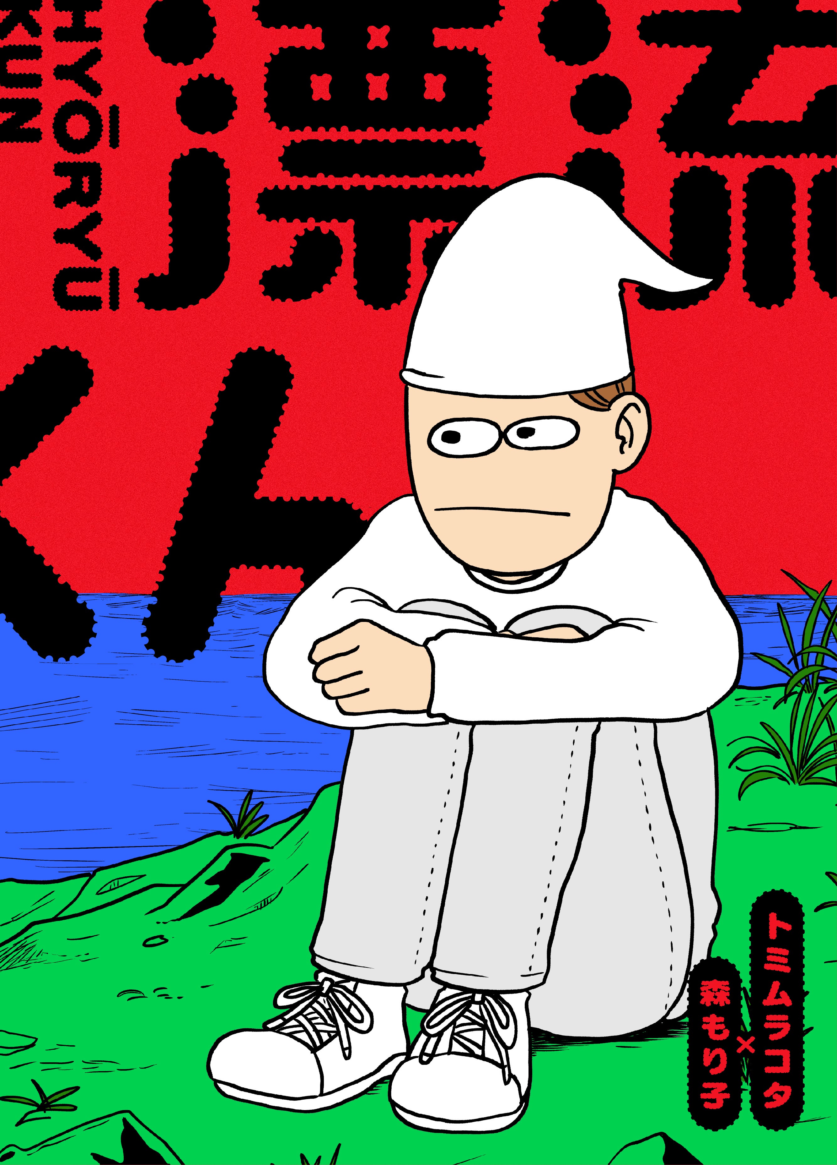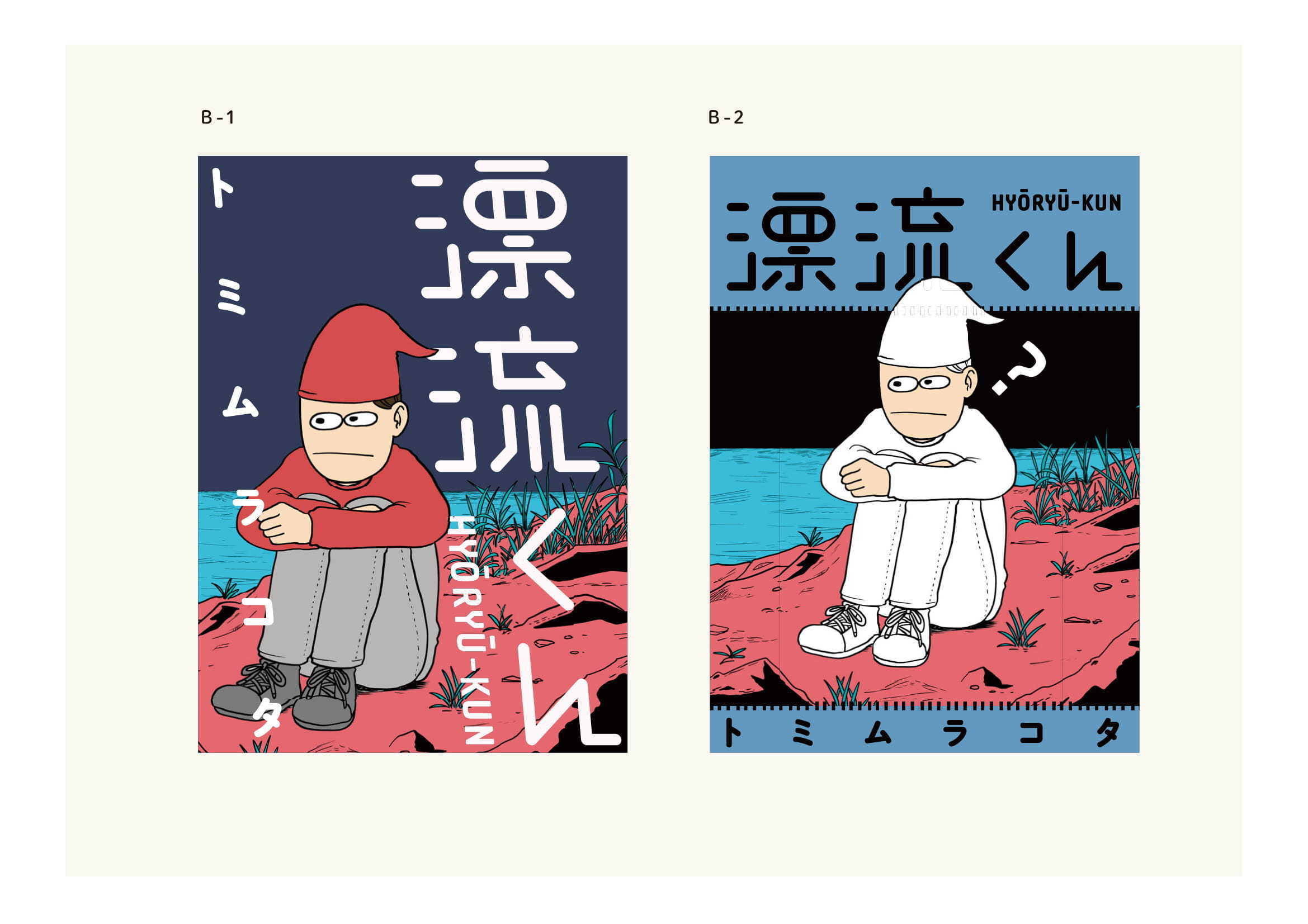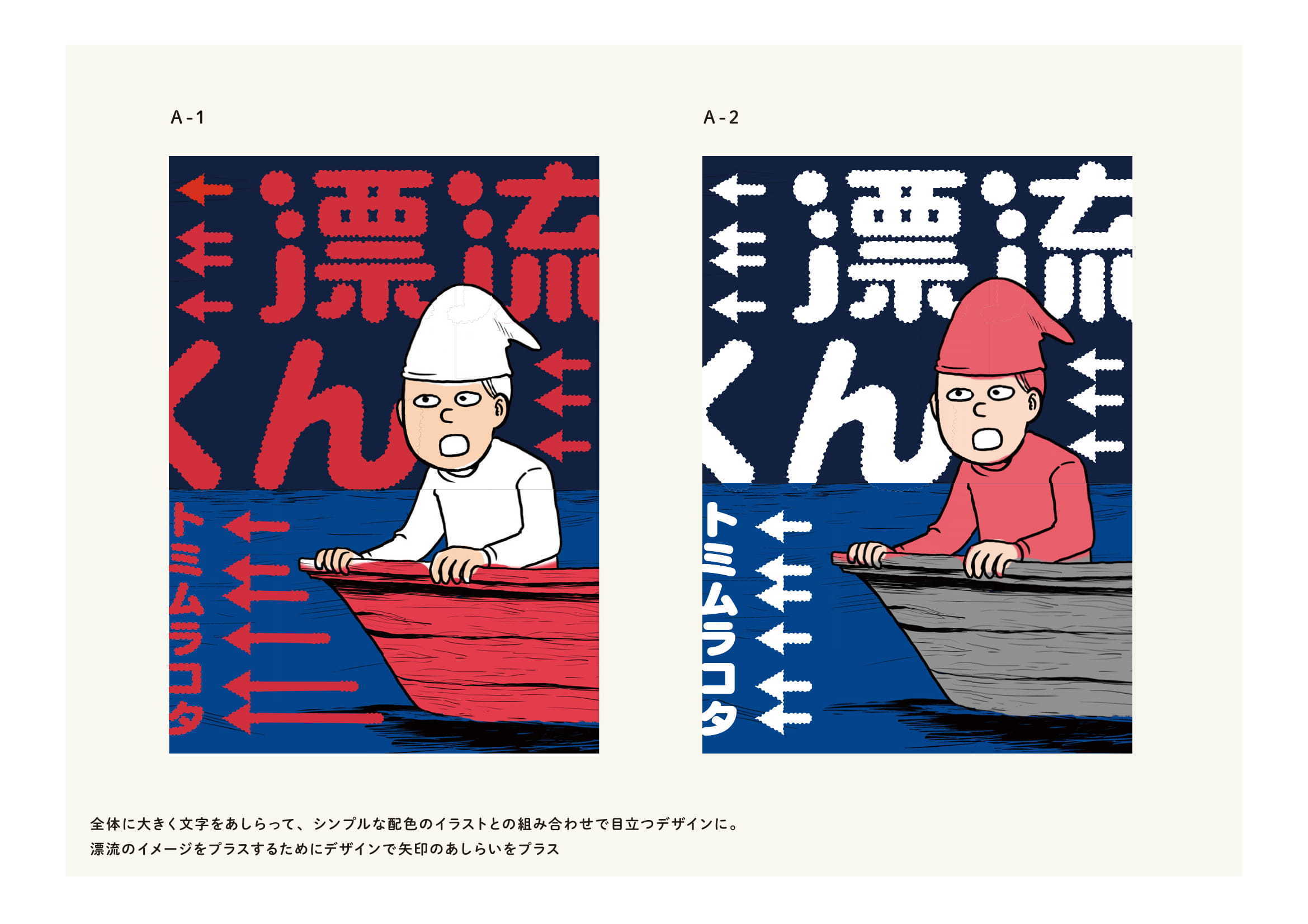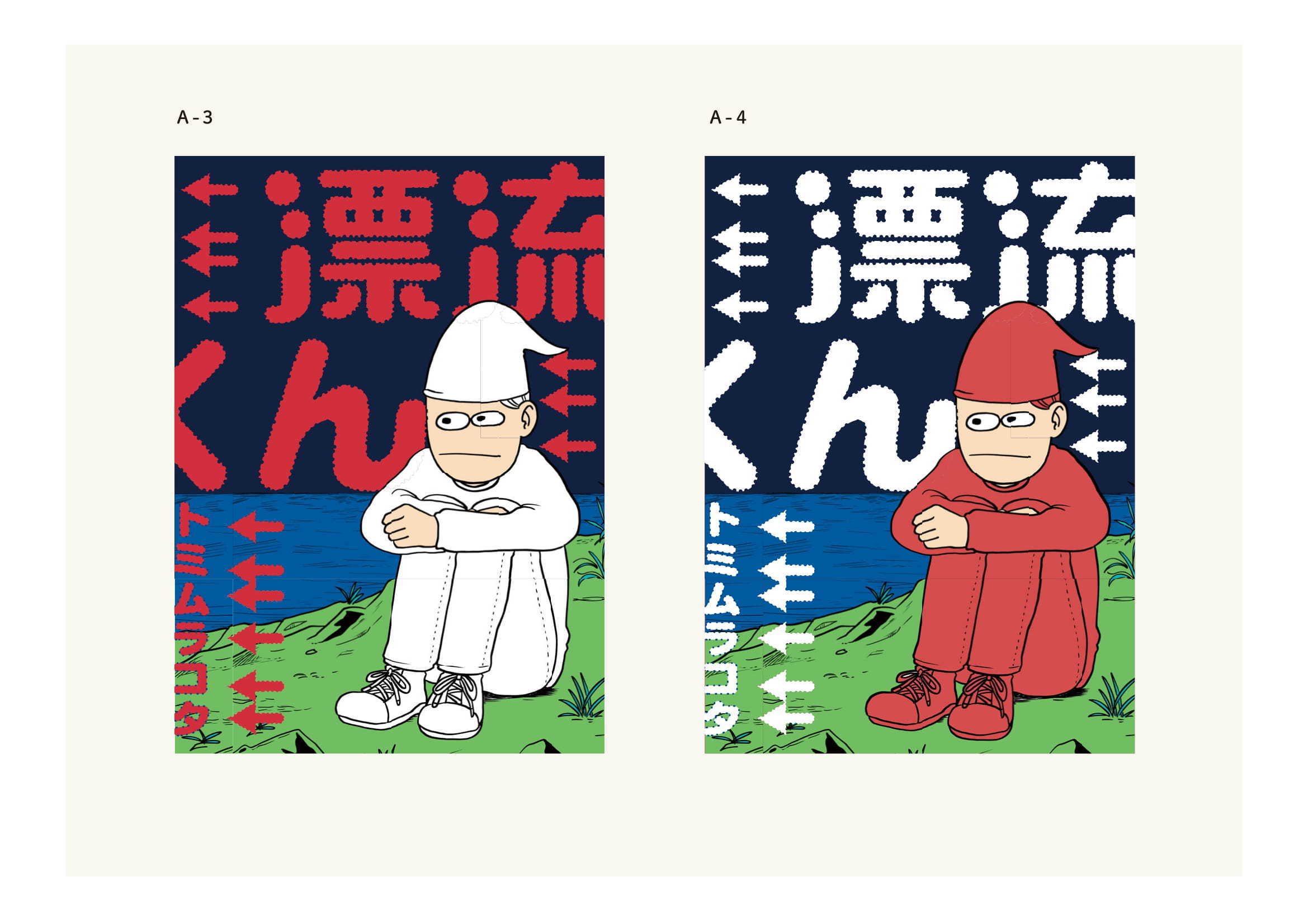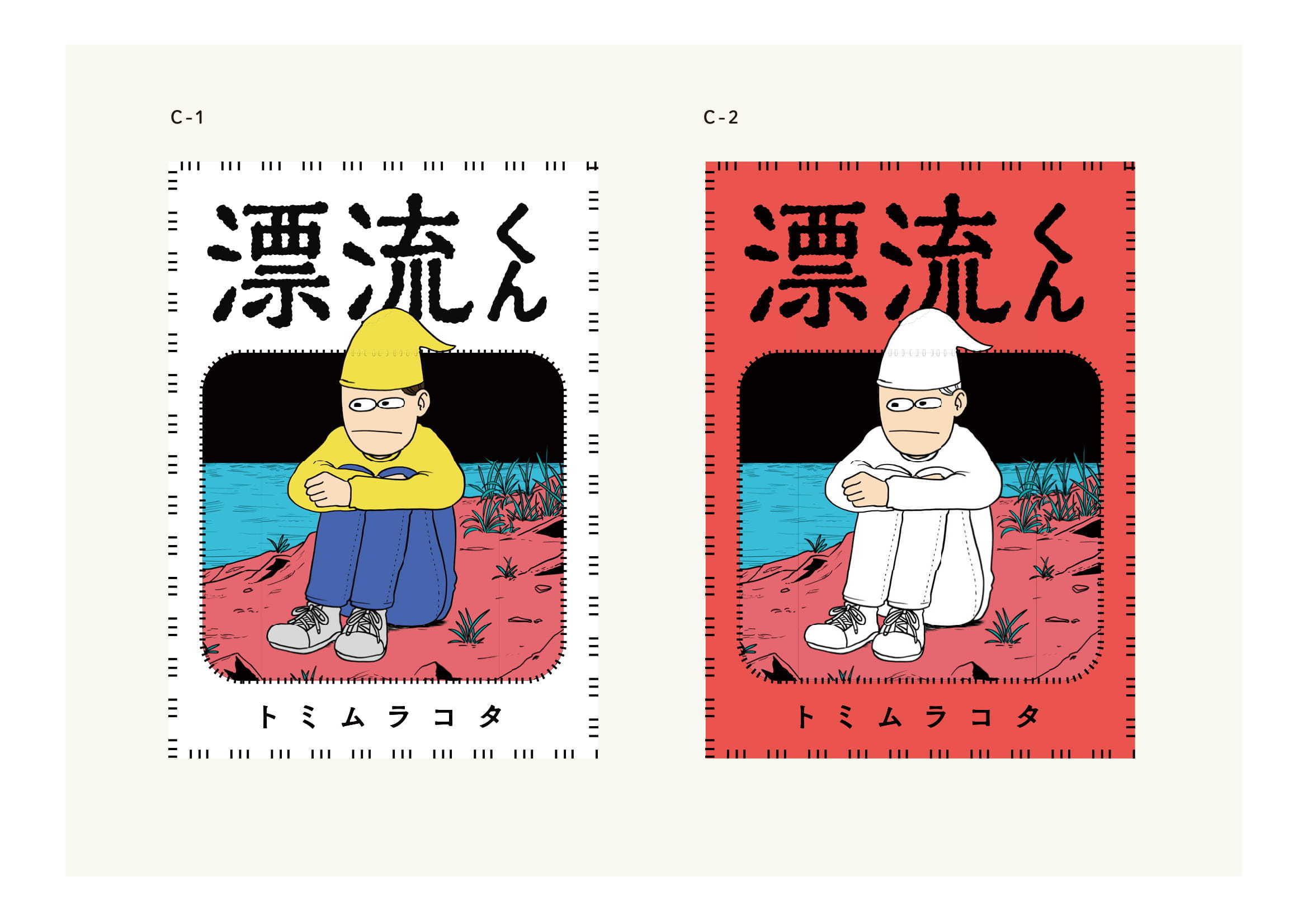 表紙デザインは、漂流くんの孤独なのにひょうひょうとしているキャラクターの感じが伝わるように、あえて人物のイラストはモノトーンにして、背景の色味を奇怪で派手な色使いにして、よくわからないところに一人でいる感じが伝わるようなデザインにしています。ロゴの文字は二行に崩して、あえて左右にズラして入れることで、漂う水の流れを感じさせるように配置しています。