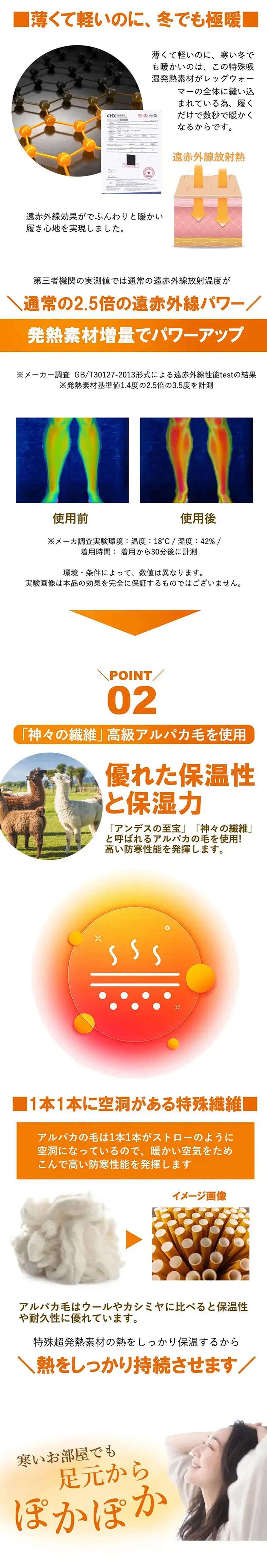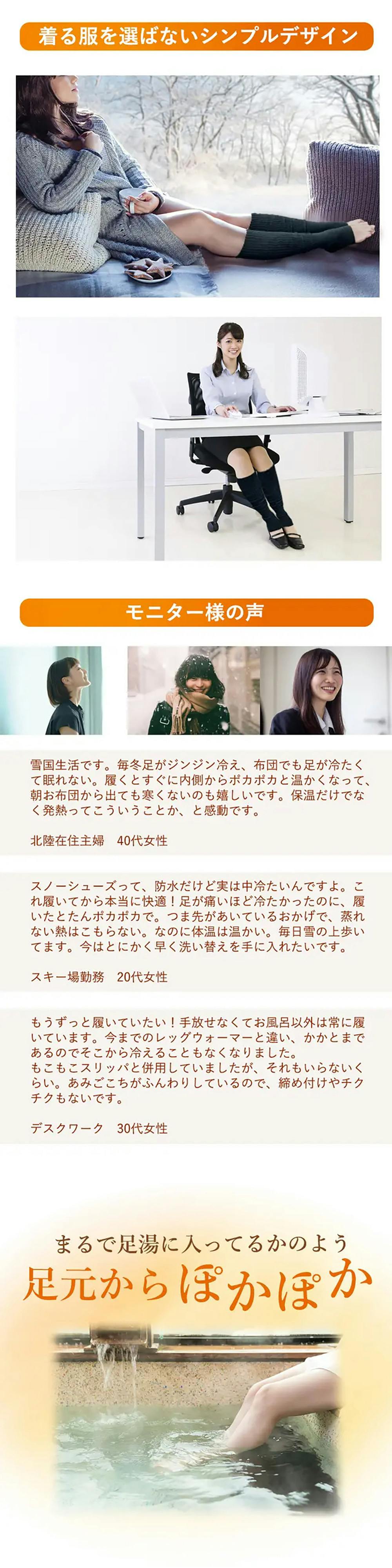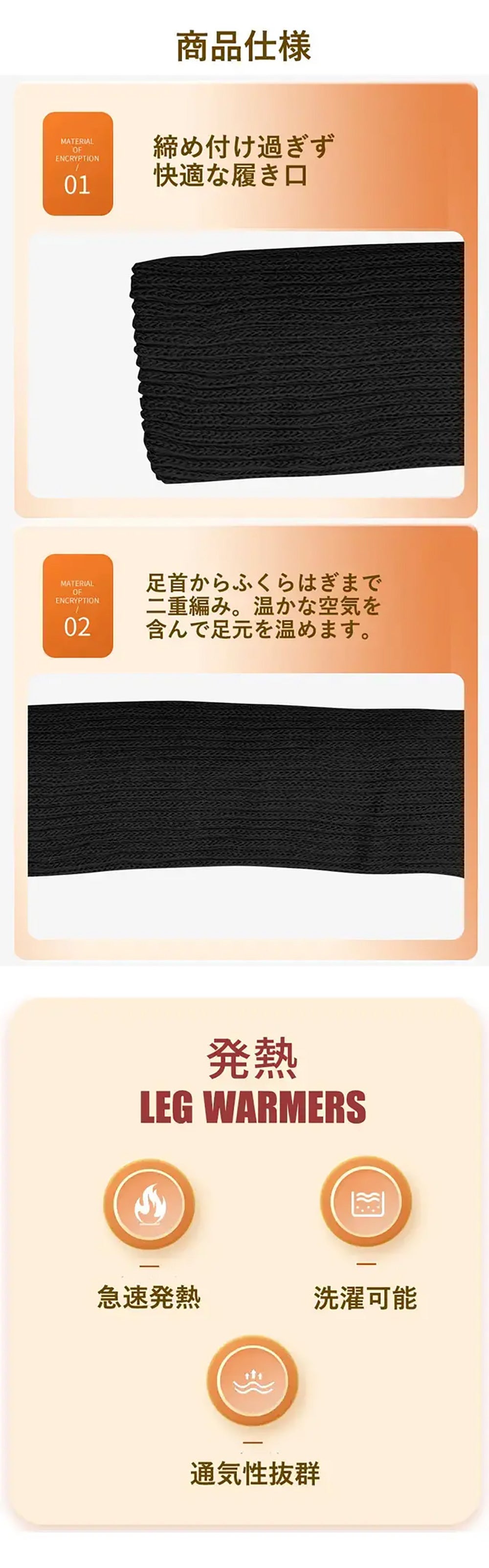 ※参考として、足のサイズ22cm~26cmを推奨しておりますが、特性上つま先があいておりますので、上記のサイズが合えば足のサイズに関わらずご着用頂けます。男性も、上記サイズ内(特にふくらはぎの円周が48.0cm以内)であればもちろんご着用頂ける『男女兼用型』でございますので、どうぞ上記サイズをご参考にご検討いただければと存じます。
