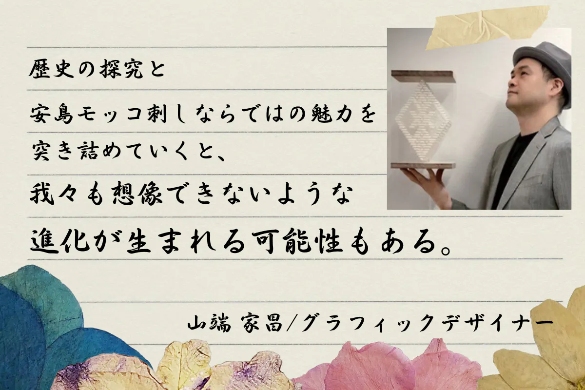 青森県津軽地方で生まれた伝統的な刺し子「こぎん刺し」をメインとしたデザインを仕事にしているグラフィックデザイナーの山端 家昌(ヤマハタ イエマサ)と申します。