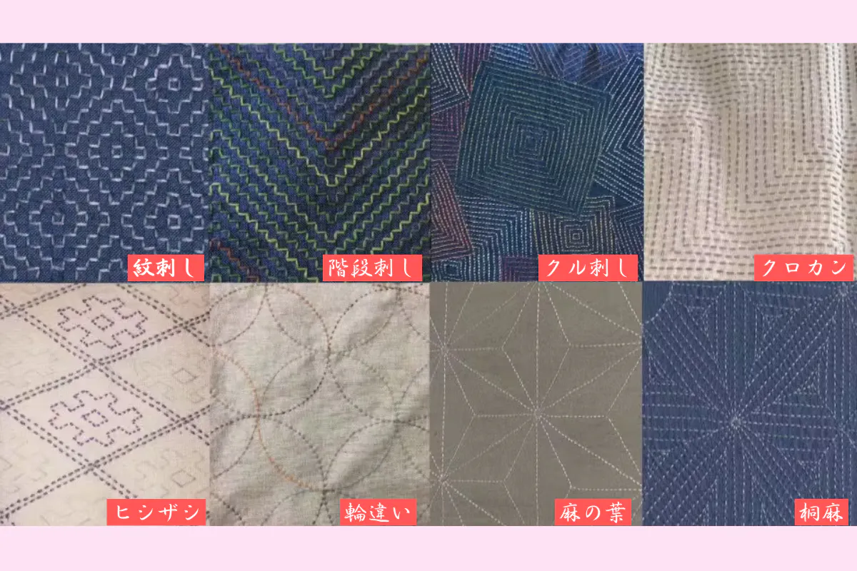 【紋刺し・階段刺し・クル刺し・クロカン・ヒシザシ・輪違い・麻の葉・桐麻】