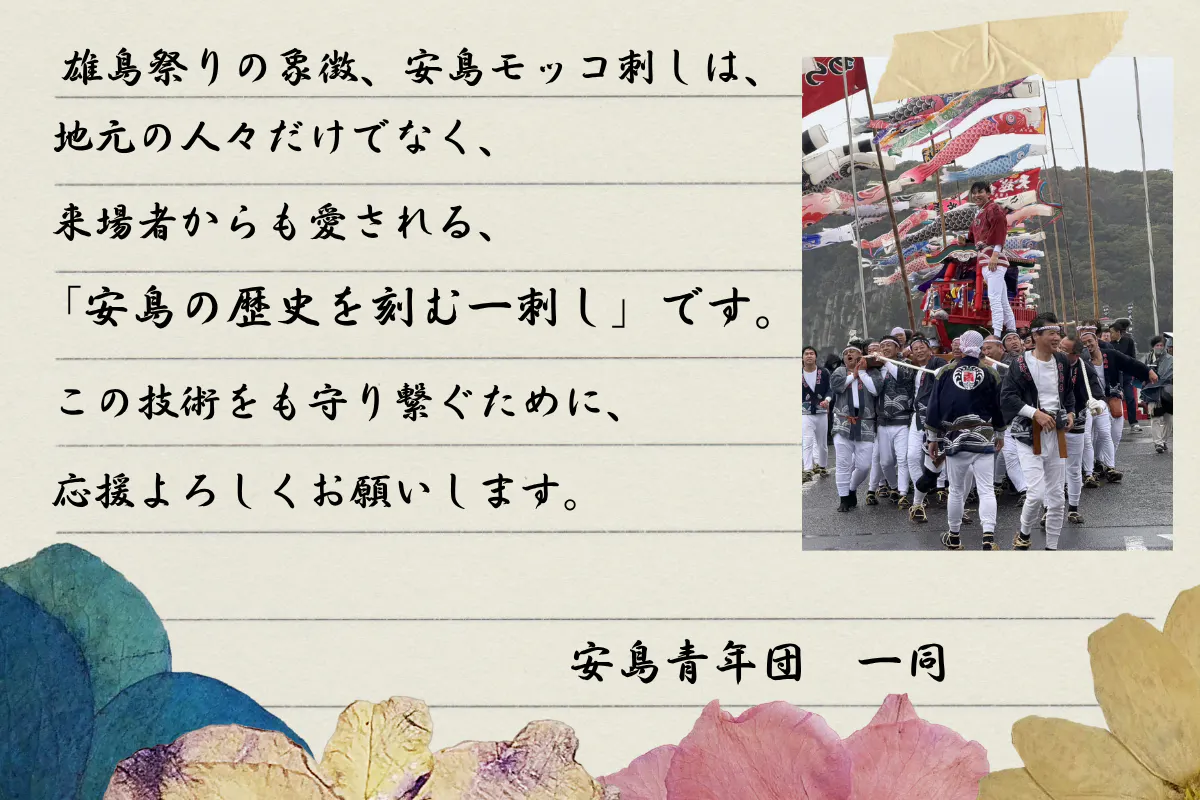 皆さんの応援があってこそ、この安島モッコ刺しは守られ、未来に続きます。