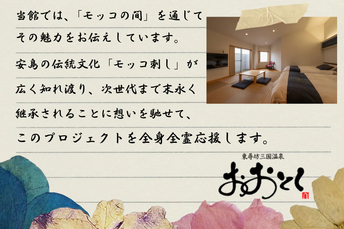 そんな中、地元安島で長年営業させて頂いている当館にとっても、大事な伝統文化であるモッコ刺しを少しでもアピール出来ればと想い、一昨年、モッコ刺しをモチーフにした「モッコの間」をリニューアルオープンさせました。