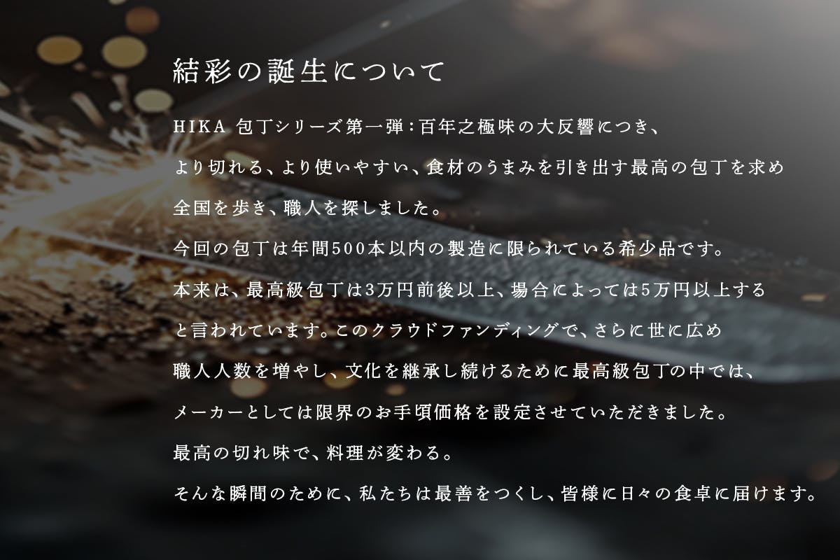 私たちは、ものづくりの現場に立つ中で、 “伝統の技”が次の世代に受け継がれにくくなっている現実を見てきました。それでも、そこにある職人の想いや美しさを、 途絶えさせたくない。その想いから「HIKA」は始まりました。包丁という道具を通して、 日本の手仕事が生み出す“美しさ”や“心地よさ”を、 もっと多くの人の日常に届けたい。クラウドファンディングは、 その想いを「共感」という形で分かち合うための挑戦です。あなたの支援が、 職人の未来を照らす灯りになり、 次の世代へとつながる力になります。「日本の伝統を、暮らしの中で息づかせる。」