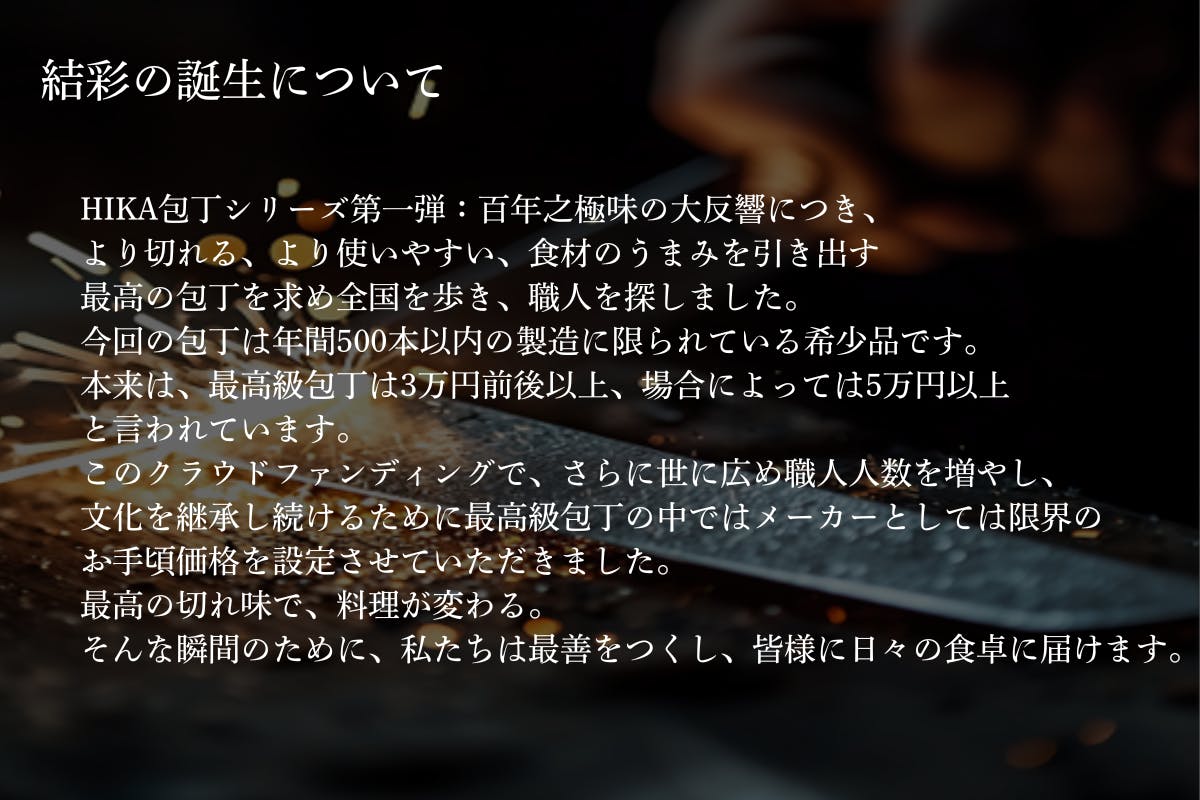 私たちは、ものづくりの現場に立つ中で、 “伝統の技”が次の世代に受け継がれにくくなっている現実を見てきました。それでも、そこにある職人の想いや美しさを、 途絶えさせたくない。その想いから「HIKA」は始まりました。包丁という道具を通して、 日本の手仕事が生み出す“美しさ”や“心地よさ”を、 もっと多くの人の日常に届けたい。クラウドファンディングは、 その想いを「共感」という形で分かち合うための挑戦です。あなたの支援が、 職人の未来を照らす灯りになり、 次の世代へとつながる力になります。「日本の伝統を、暮らしの中で息づかせる。」