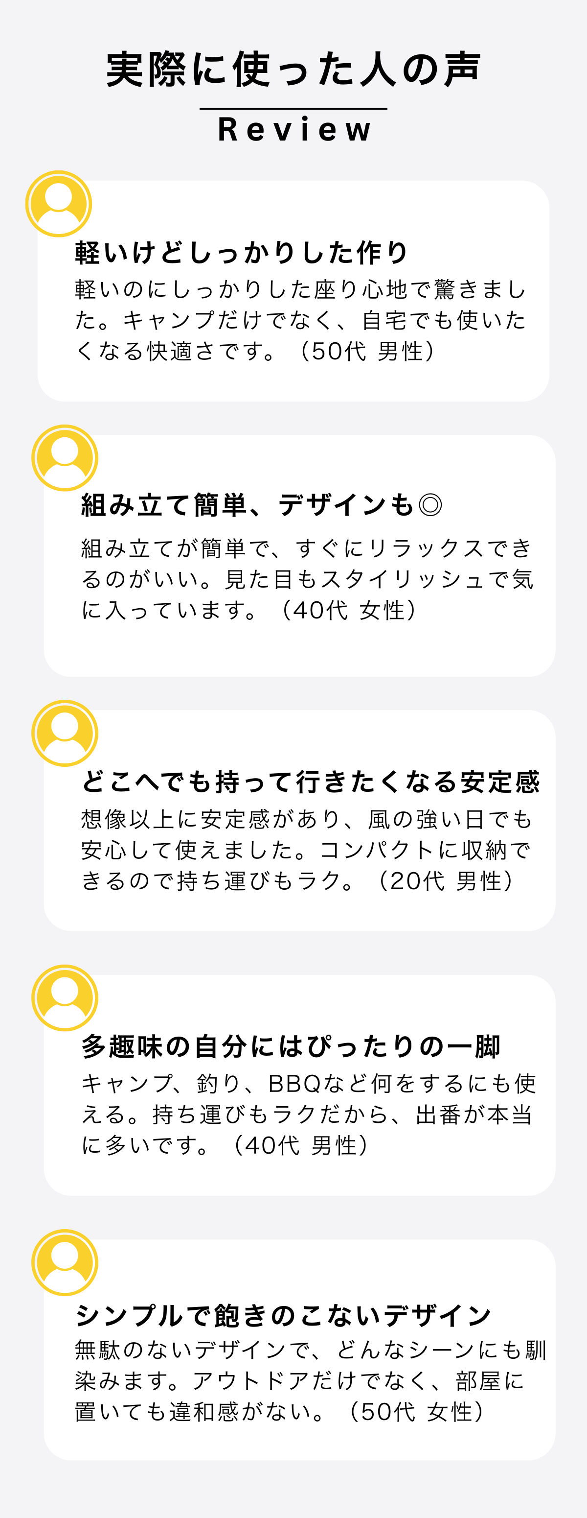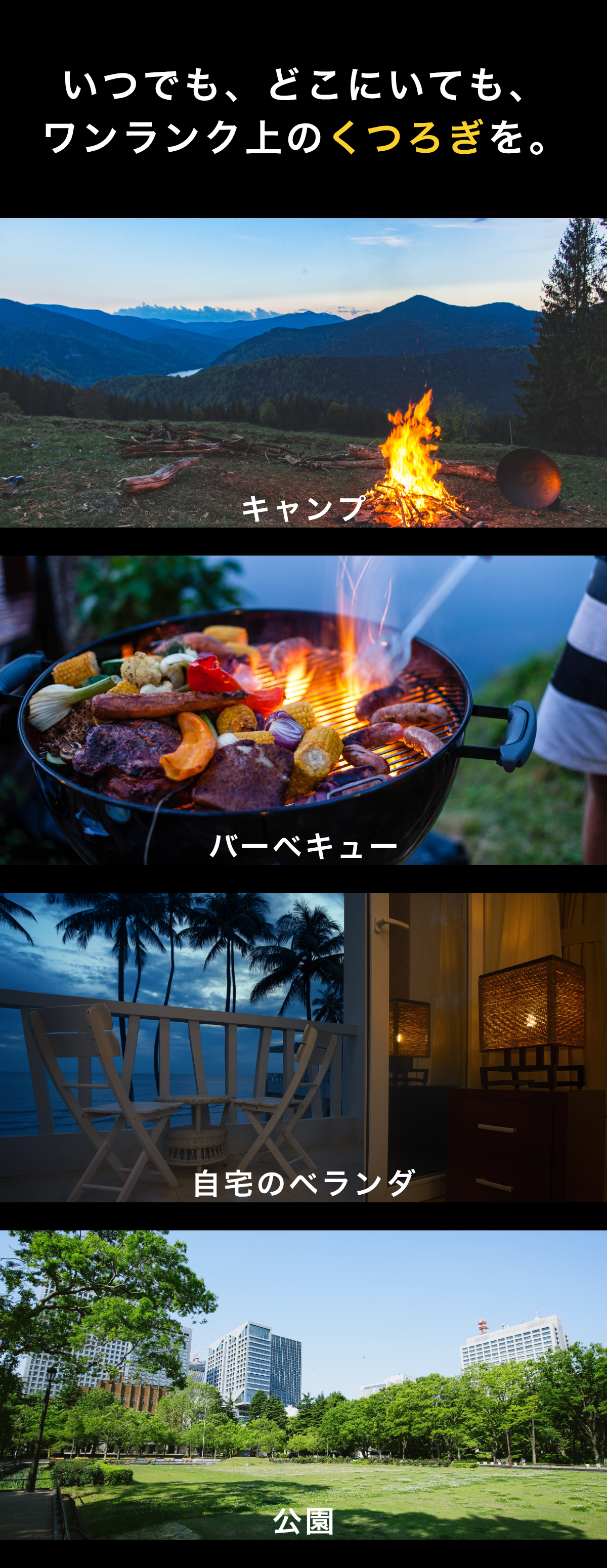 アウトドアはもちろん、ベランダやリビング、オフィスでも活躍する“どこでもリラックスできる椅子”。皆さまの日常に、少しの心地よさと豊かさをお届けできれば幸いです。