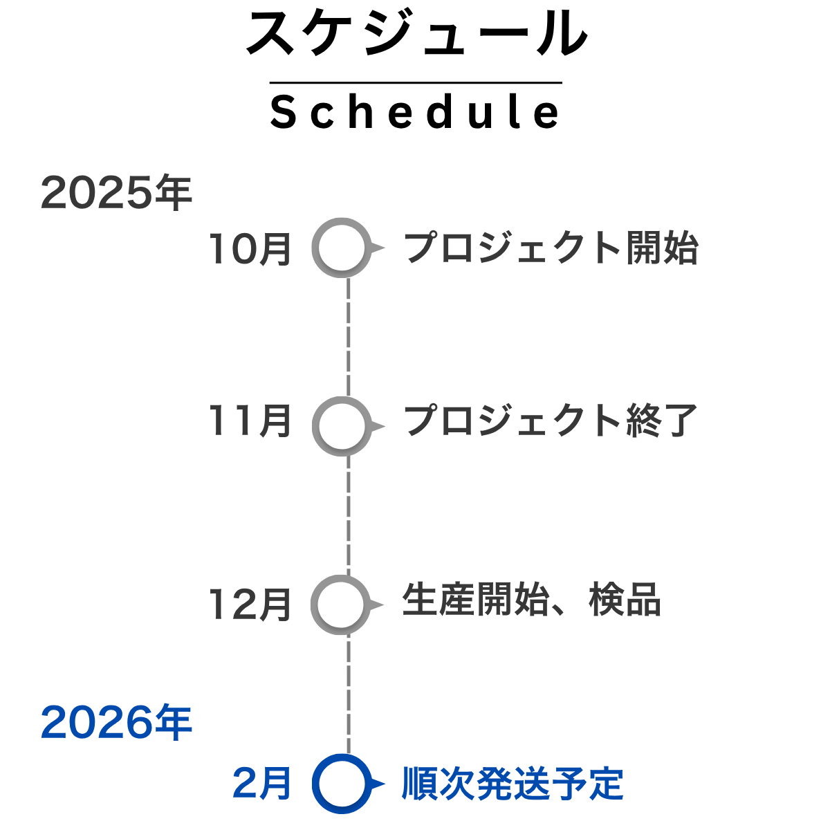 A. リターンページに記載のお届け予定月(例:2026年2月)に順次発送いたします。製造や輸送状況により多少前後する可能性があります。進捗はCAMPFIREの活動報告にてご案内いたします。