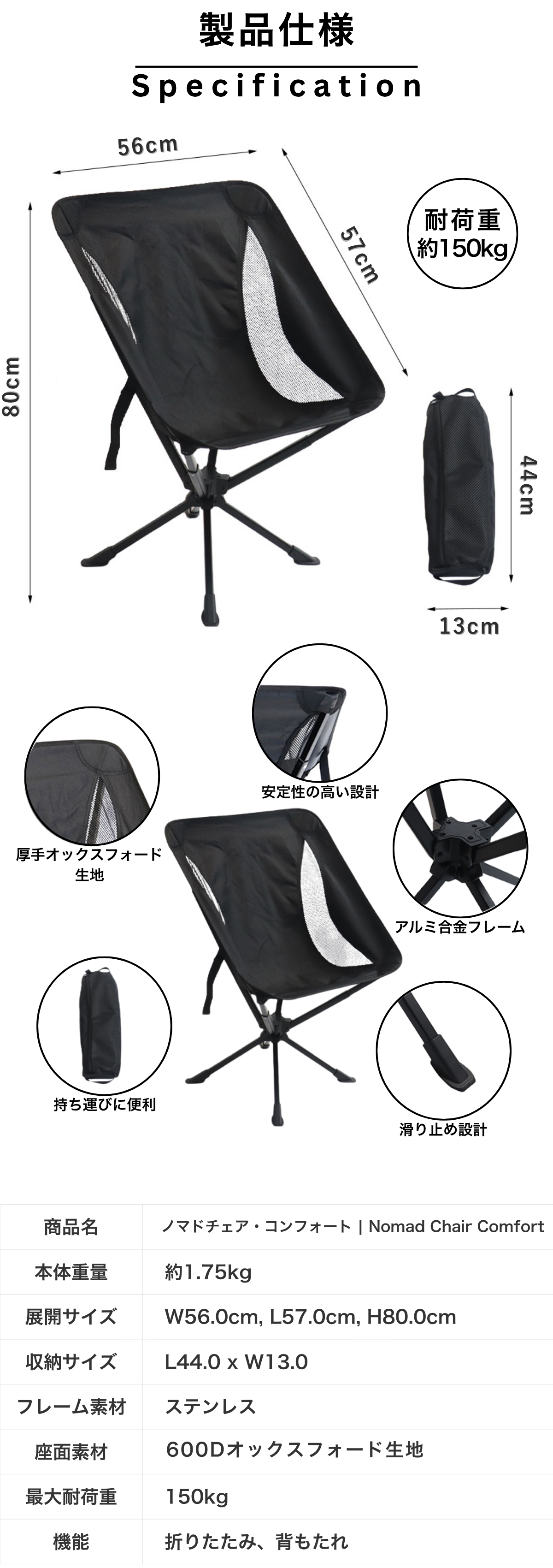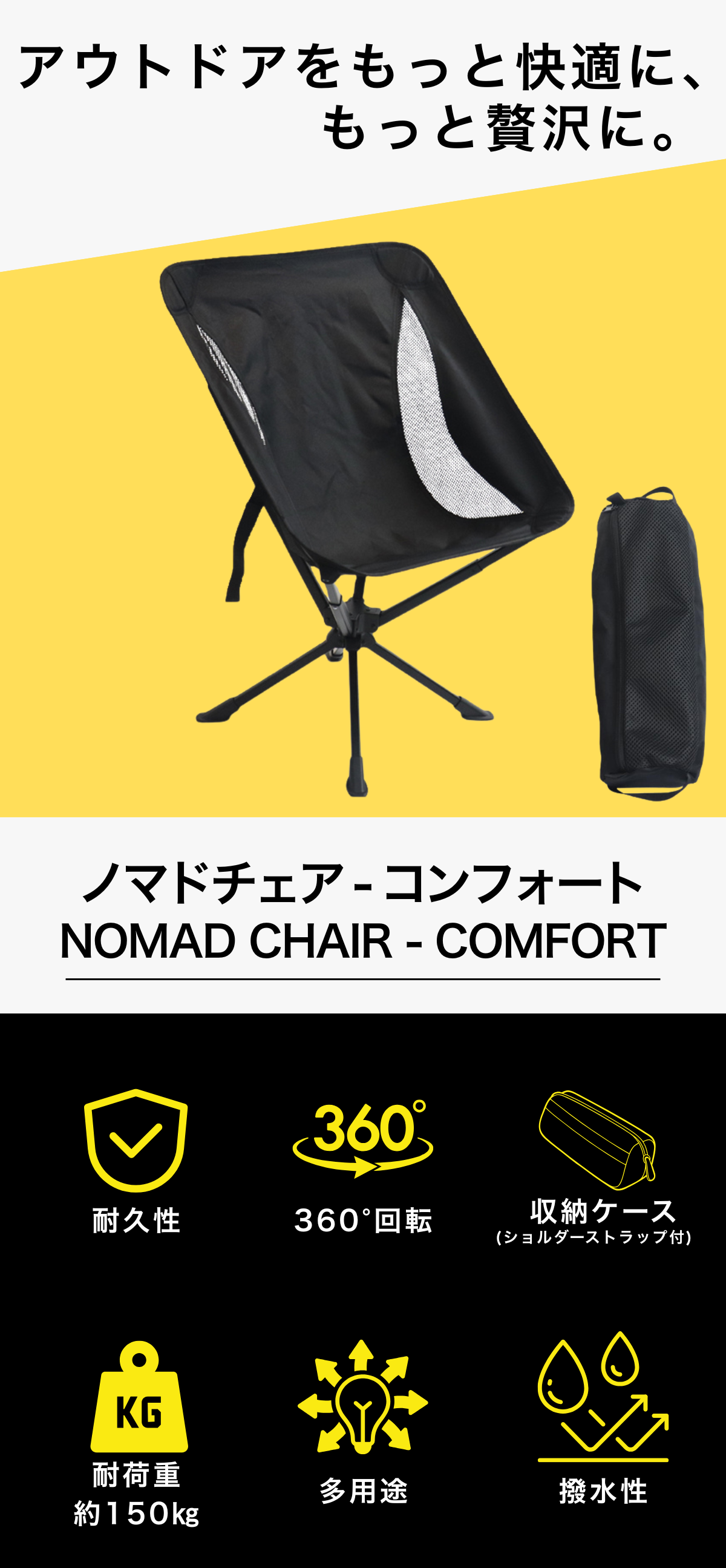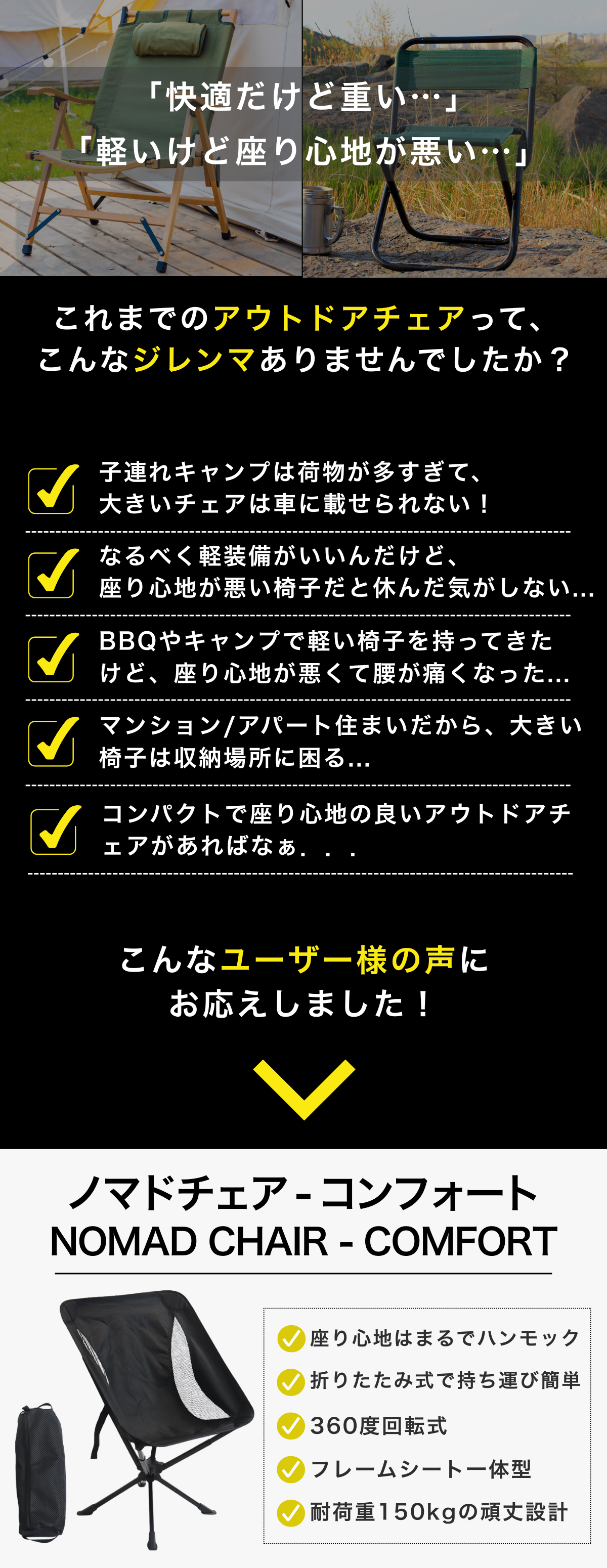 今回ご紹介する折りたたみチェア『ノマドチェア コンフォート』は、人気シリーズの進化版として誕生しました。「より快適に、より長く座れる」をテーマに、抜群の安定感と座り心地を追求。軽さや携帯性といったノマドチェアの魅力はそのままに、リラックス感と実用性をさらに高めました。