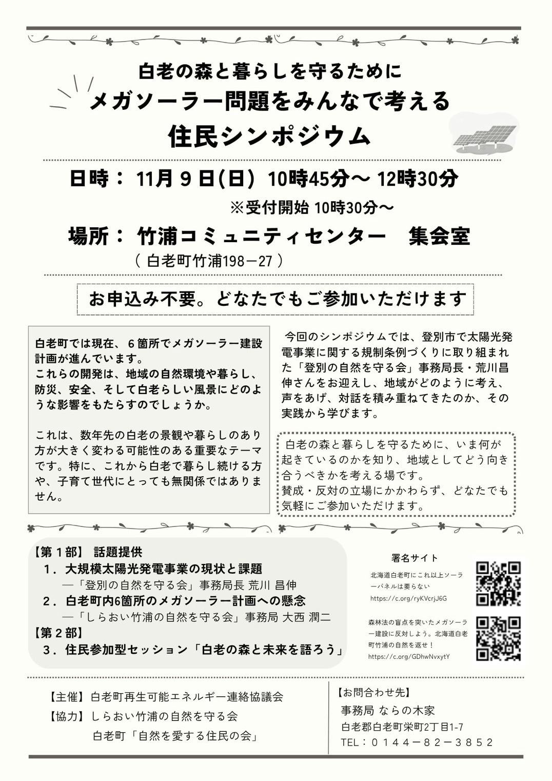 今回のシンポジウムでは、今、白老町で何が起きているのか。そして地域としてどう向き合うべきなのかを考える場にしたいと考えています。