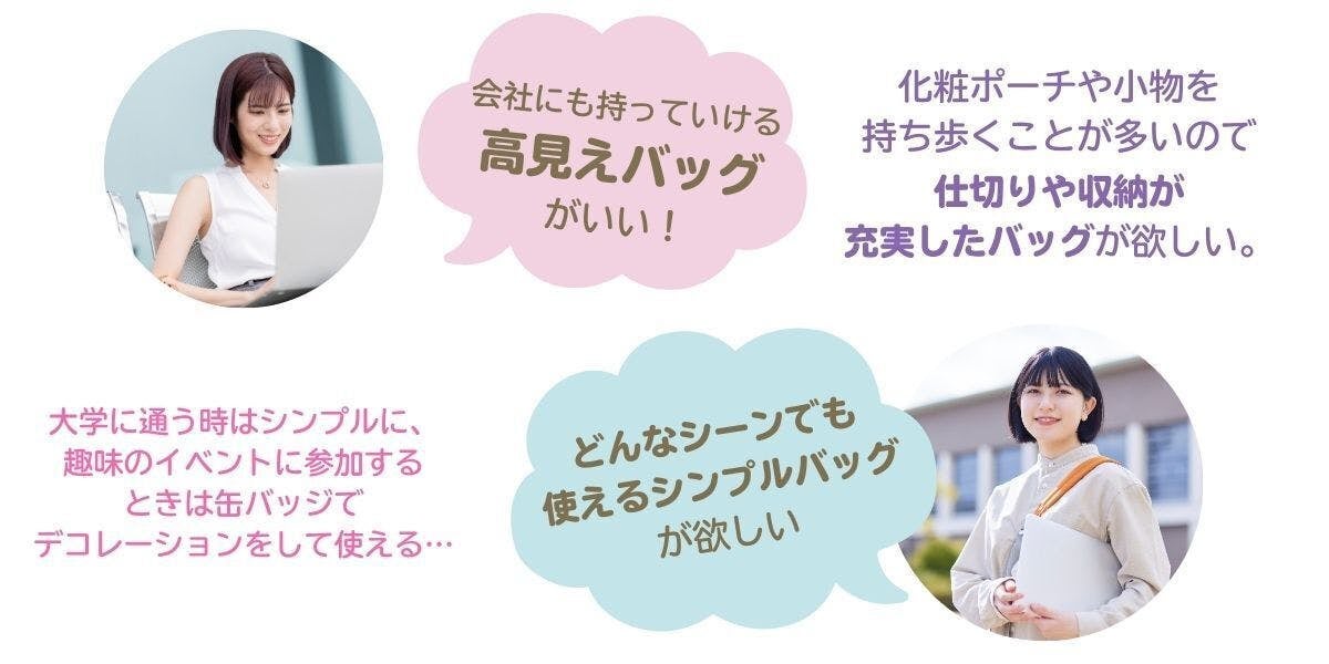 この疑問を徹底的に考え、通勤通学などの普段使いのバッグへのニーズだけでなく、今回は趣味や旅行でも利用できるよう、たくさんの人の意見を集めました。