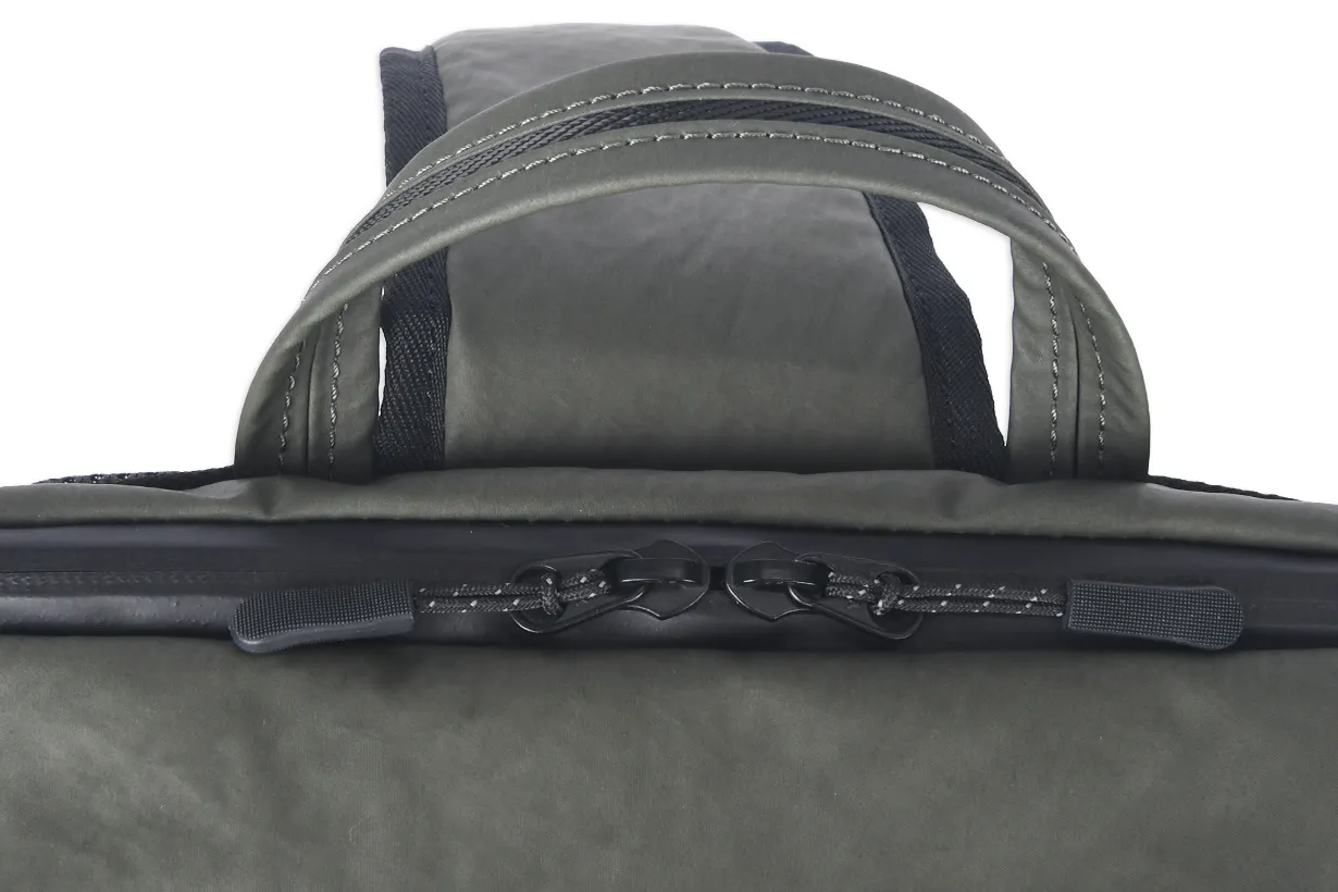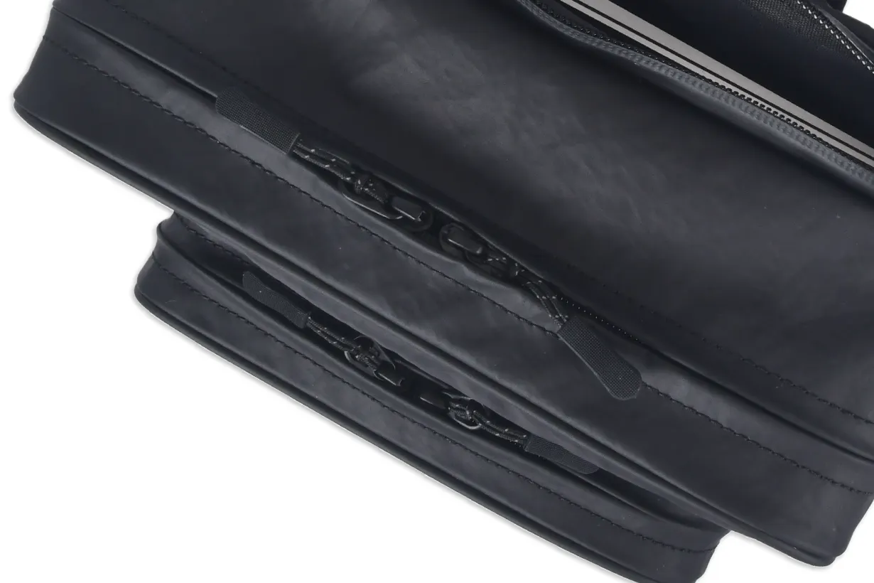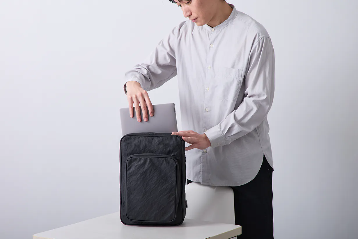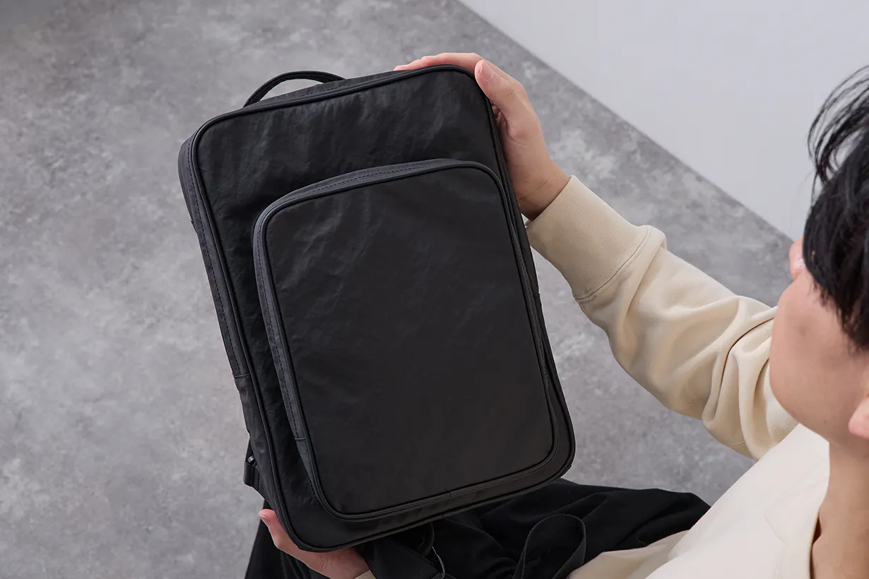 素材自体が持つ高い引き裂き強度と、高耐久樹脂由来の圧倒的なタフさが、突然の雨や水、汚れなどのアクシデントから大切な荷物を守り、永くお使いいただくことができます。