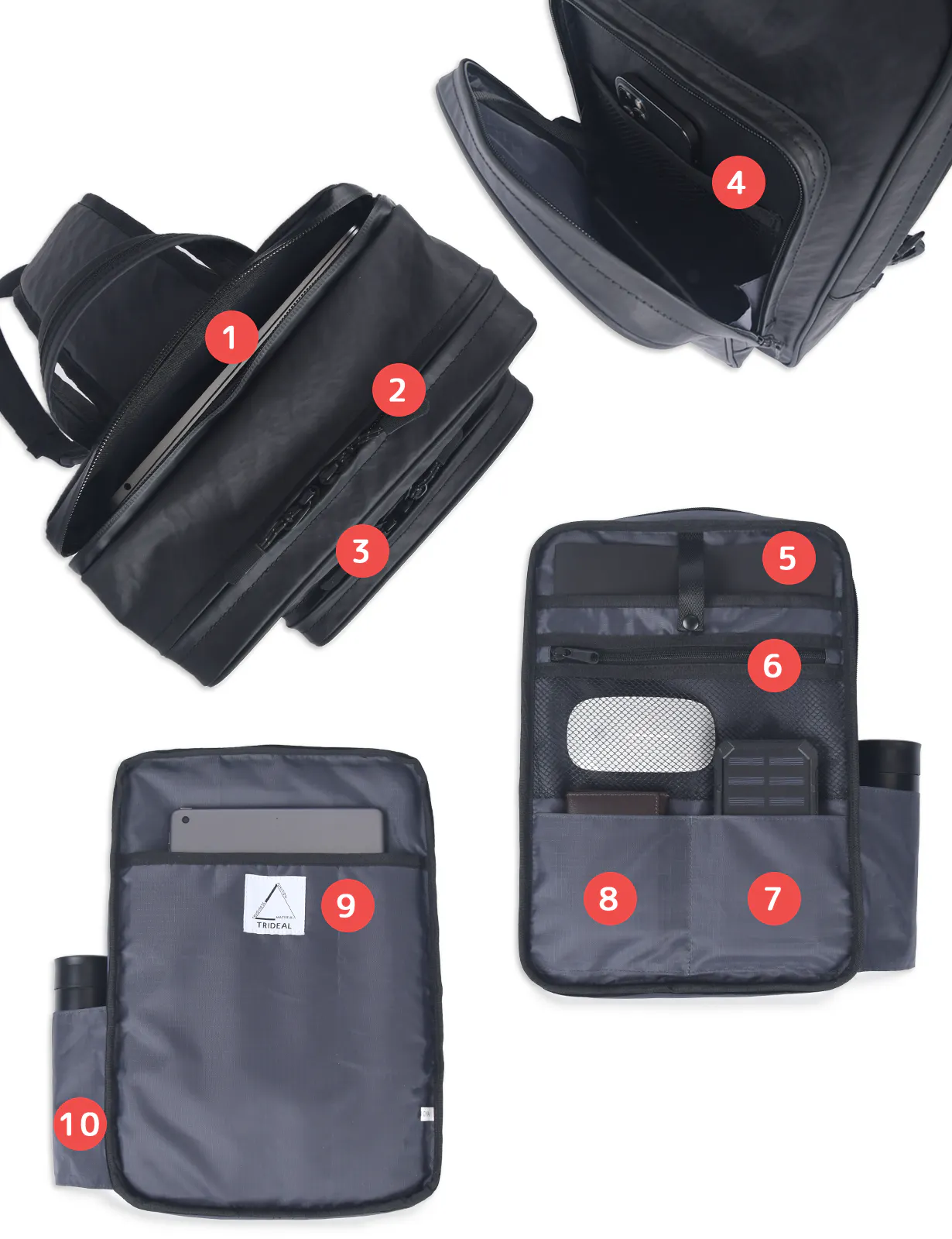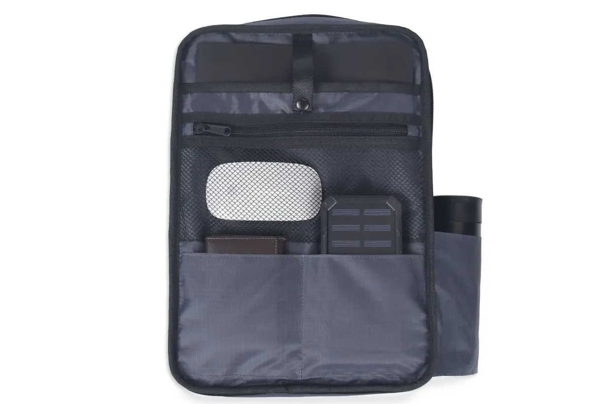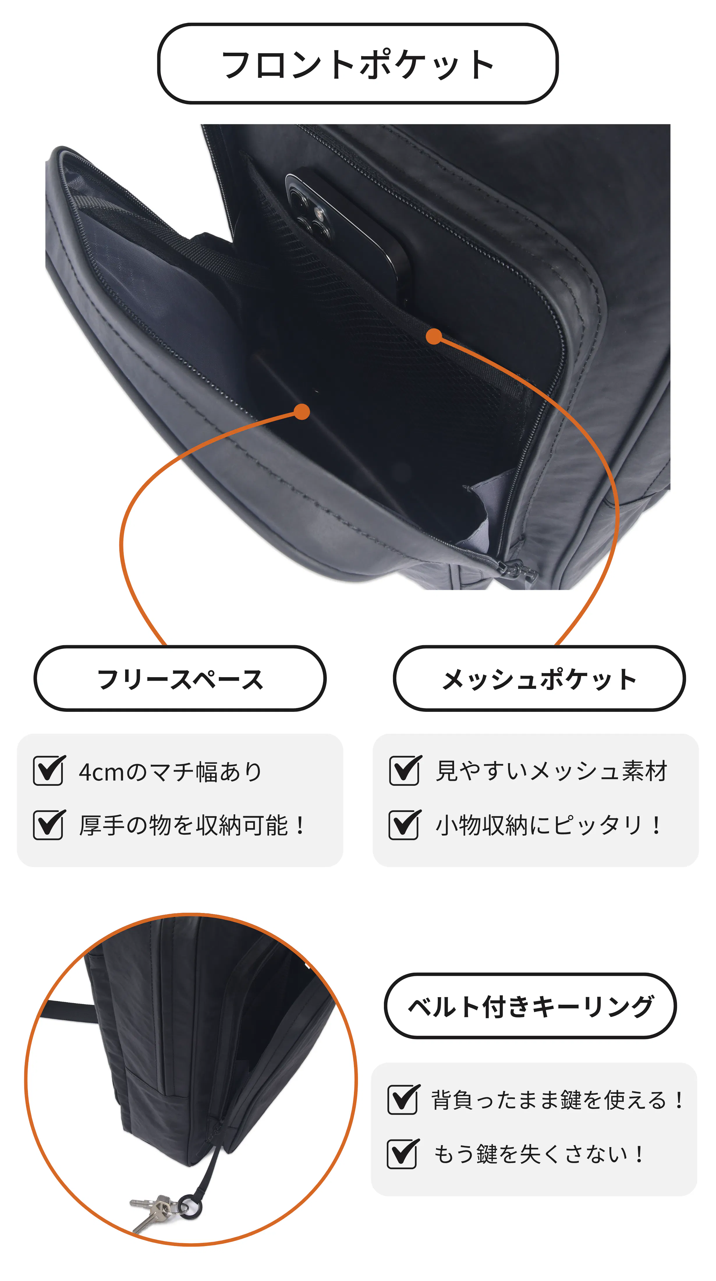 フロントポケットには、TRIDEALの製品で好評をいただいている、バッグを背負ったまま使えるキーリングを設置しました。