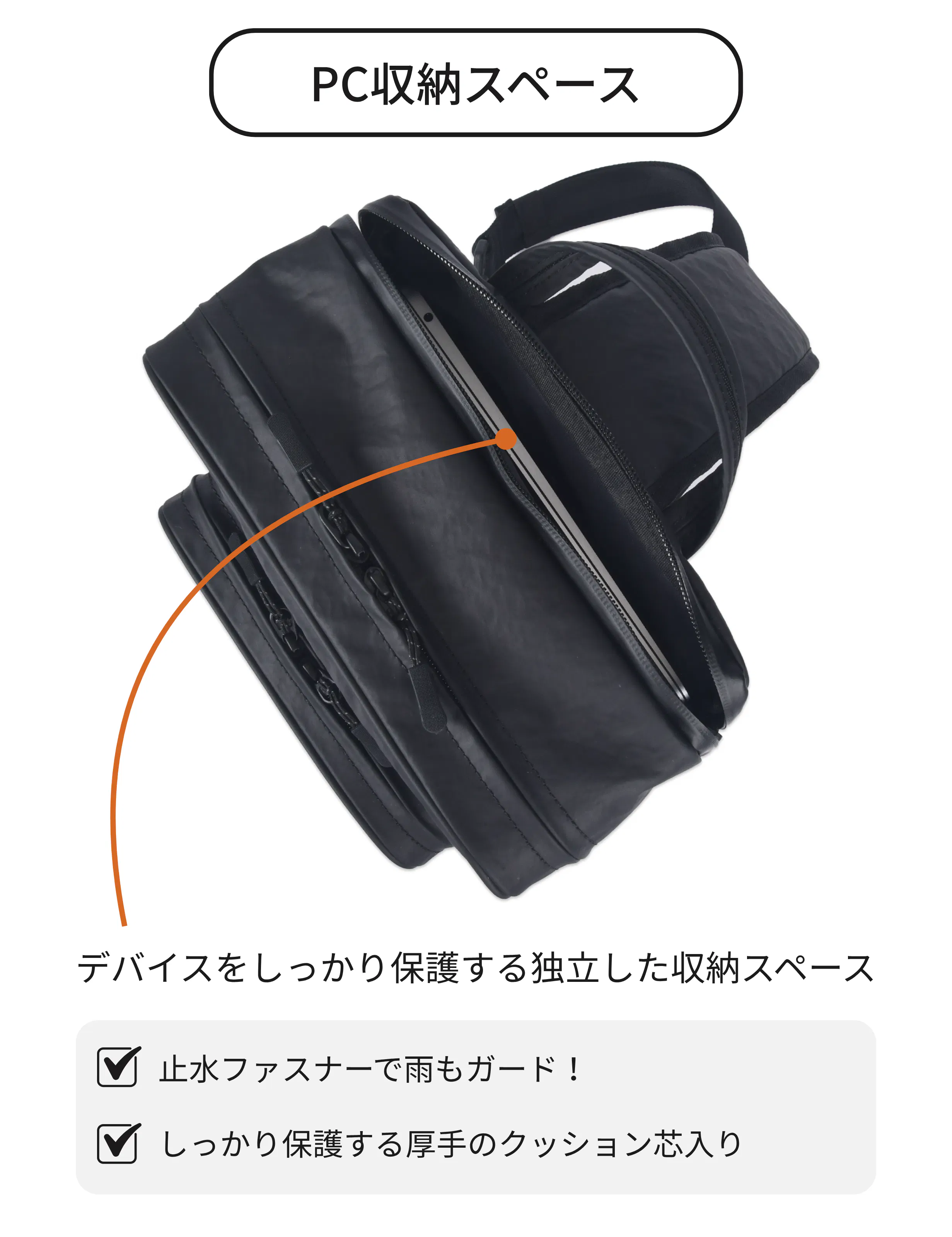 独立したPC収納スペースを、厚手のクッション芯で両側からしっかり挟んだ構造で、通勤や移動中の衝撃からデバイスを守ります。