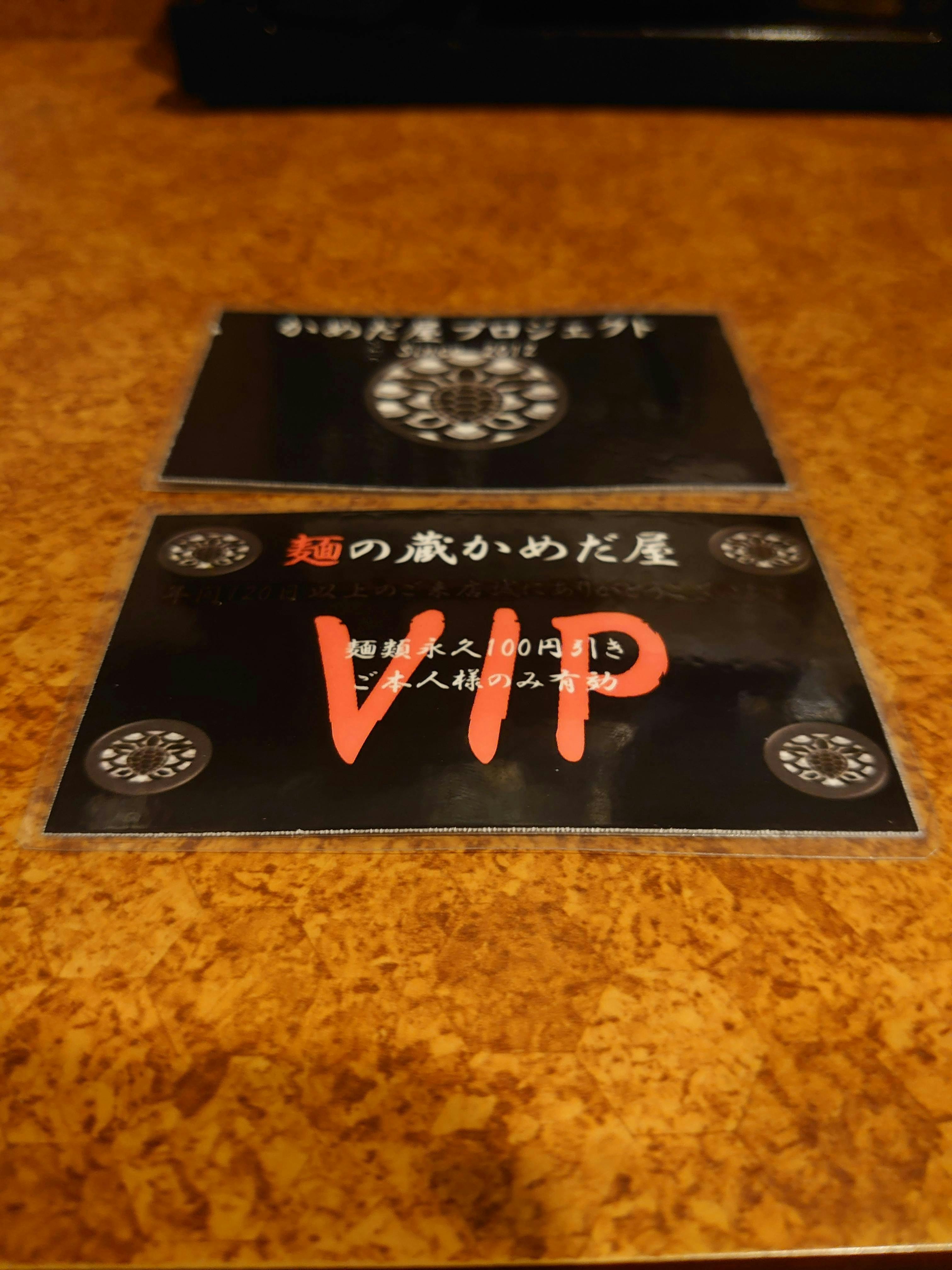 (かめだ屋VIPカード(毎回100円引き)をお渡しいたします。又、お好きなラーメン3杯ご提供させていただきます)