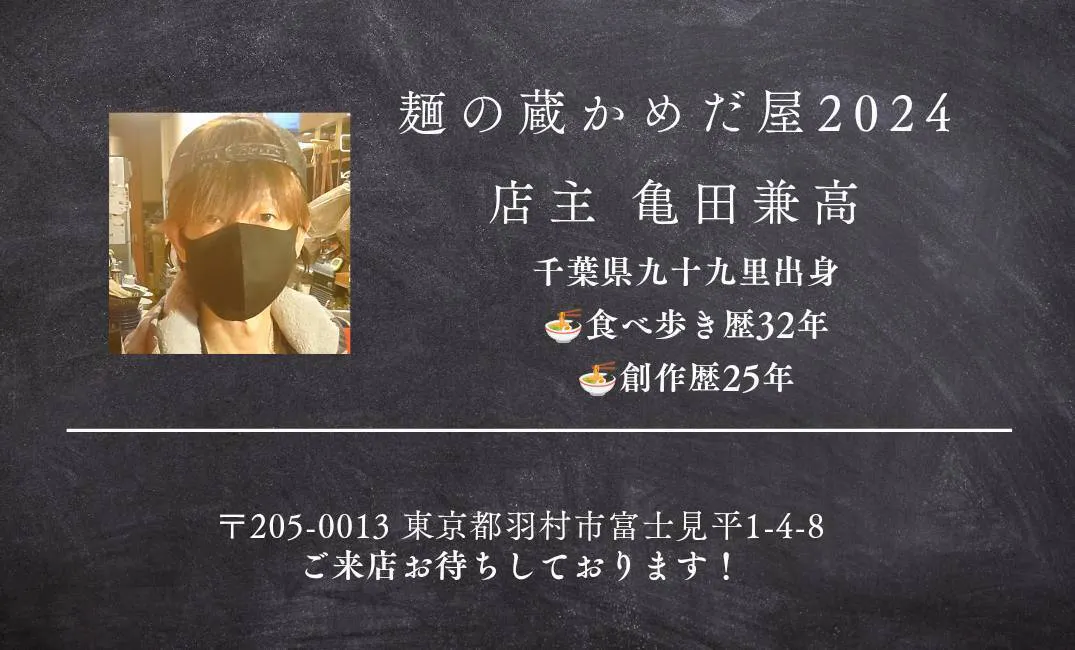 私がプロジェクト立ち上げ主になります、麺の蔵かめだ屋の店主、亀田と申します。私は、千葉県九十九里の出身、約13年前に東京都北区赤羽にて【麺の蔵かめだ屋】オープン。さらにその2年後東京都板橋区上板橋にて、【魂の中華そば】立ち上げに携わり、その後はラーメン業界を離れ、ホテル運営を展開しておりました。現在は東京都羽村市にて【麺の蔵かめだ屋2024】と共に毎週【子ども食堂】を運営しております。