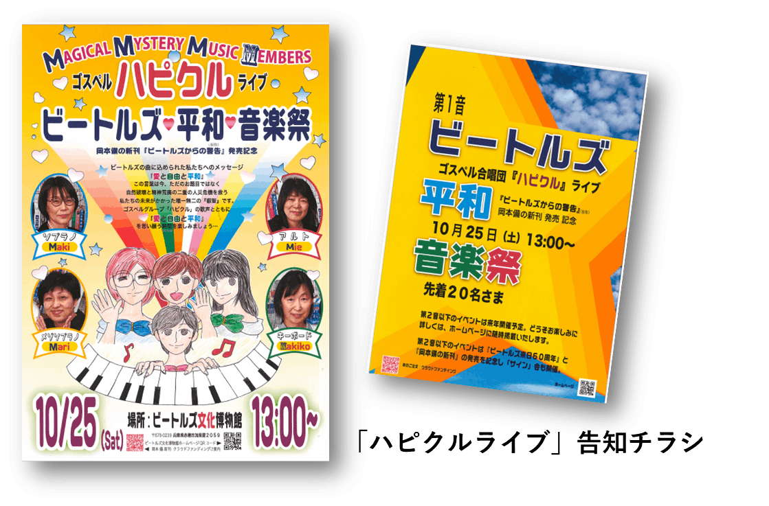 2025/11/16 07:4610月25日、ビートルズ平和音楽祭の第1音ゴズペルビートルズ・コーラスライブおかげさまで定員20名のところ26名さまのご参加をいただき立ち見が出るほどの盛況で、無事終了いたしました。ご参加いただいた方々にお配りするはずの参加者特別チラシセットが間に合わなくなり、関係者に配るはずだった分をまわしました。次回第3音〜第4音などでも参加者特別チラシを作る予定です。どうぞおたのしみください。ありがとうございました。 もっと見る