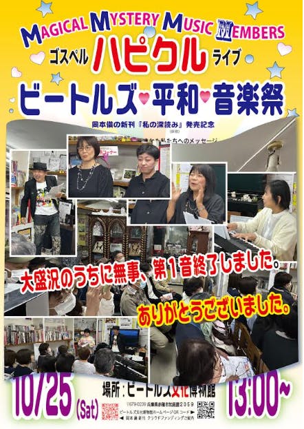 2025/11/16 07:4610月25日、ビートルズ平和音楽祭の第1音ゴズペルビートルズ・コーラスライブおかげさまで定員20名のところ26名さまのご参加をいただき立ち見が出るほどの盛況で、無事終了いたしました。ご参加いただいた方々にお配りするはずの参加者特別チラシセットが間に合わなくなり、関係者に配るはずだった分をまわしました。次回第3音〜第4音などでも参加者特別チラシを作る予定です。どうぞおたのしみください。ありがとうございました。 もっと見る