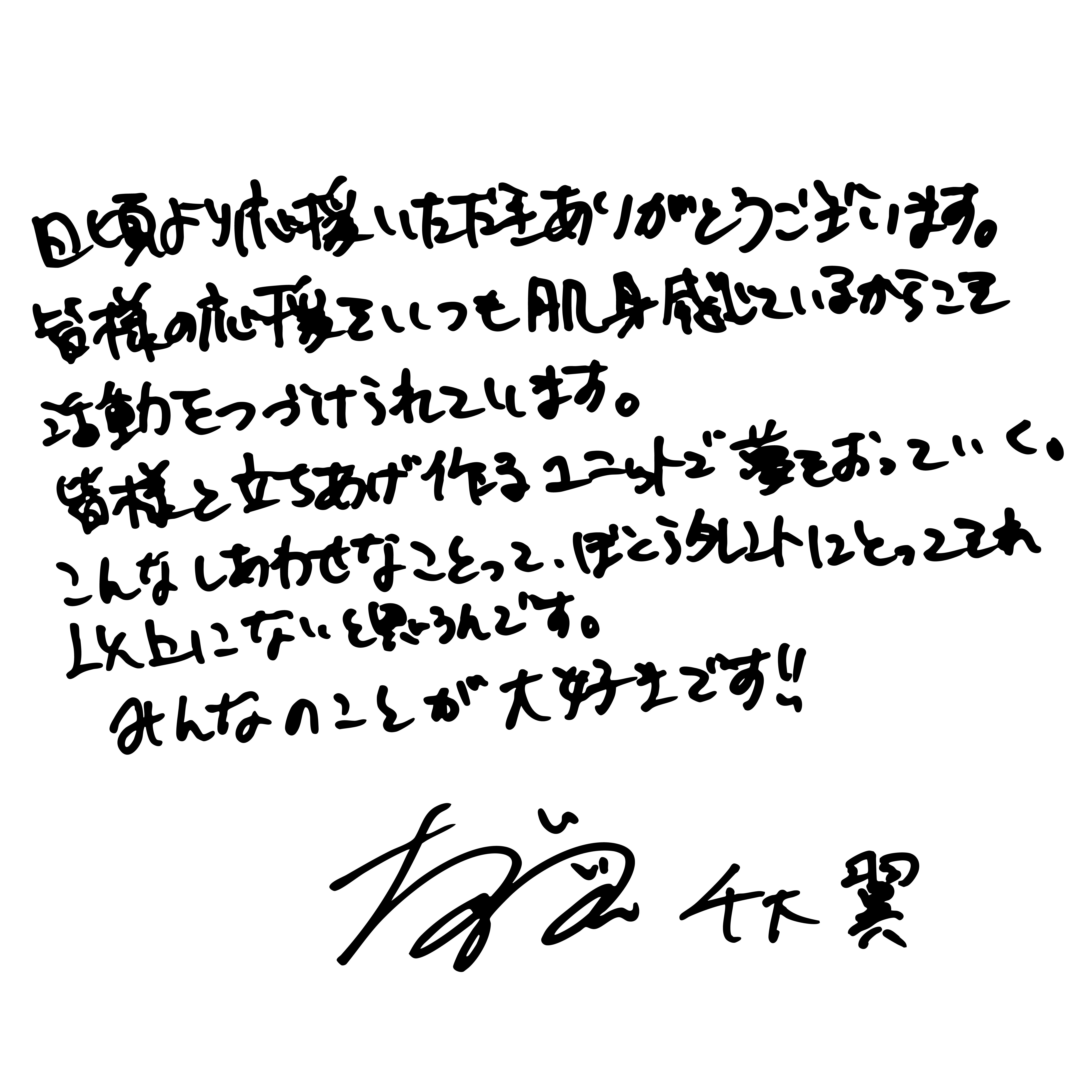 そんな中、どんなに小さなステージでも、どんなに不安な時でも、皆さんの笑顔と声援があるからこそ、今があり、未来があります。それは、どんな言葉にも代え難いくらいの感謝があります。