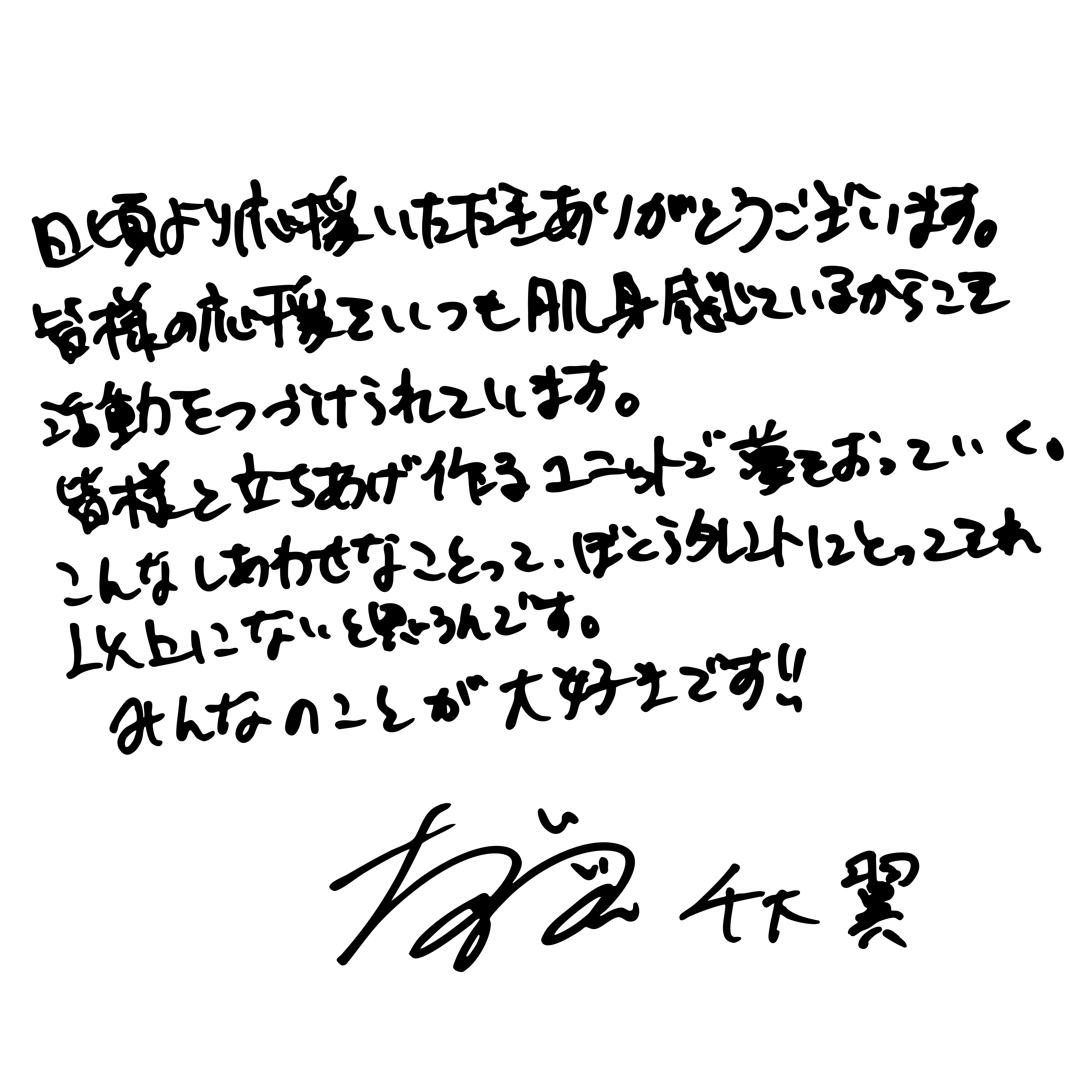 そんな中、どんなに小さなステージでも、どんなに不安な時でも、皆さんの笑顔と声援があるからこそ、今があり、未来があります。それは、どんな言葉にも代え難いくらいの感謝があります。