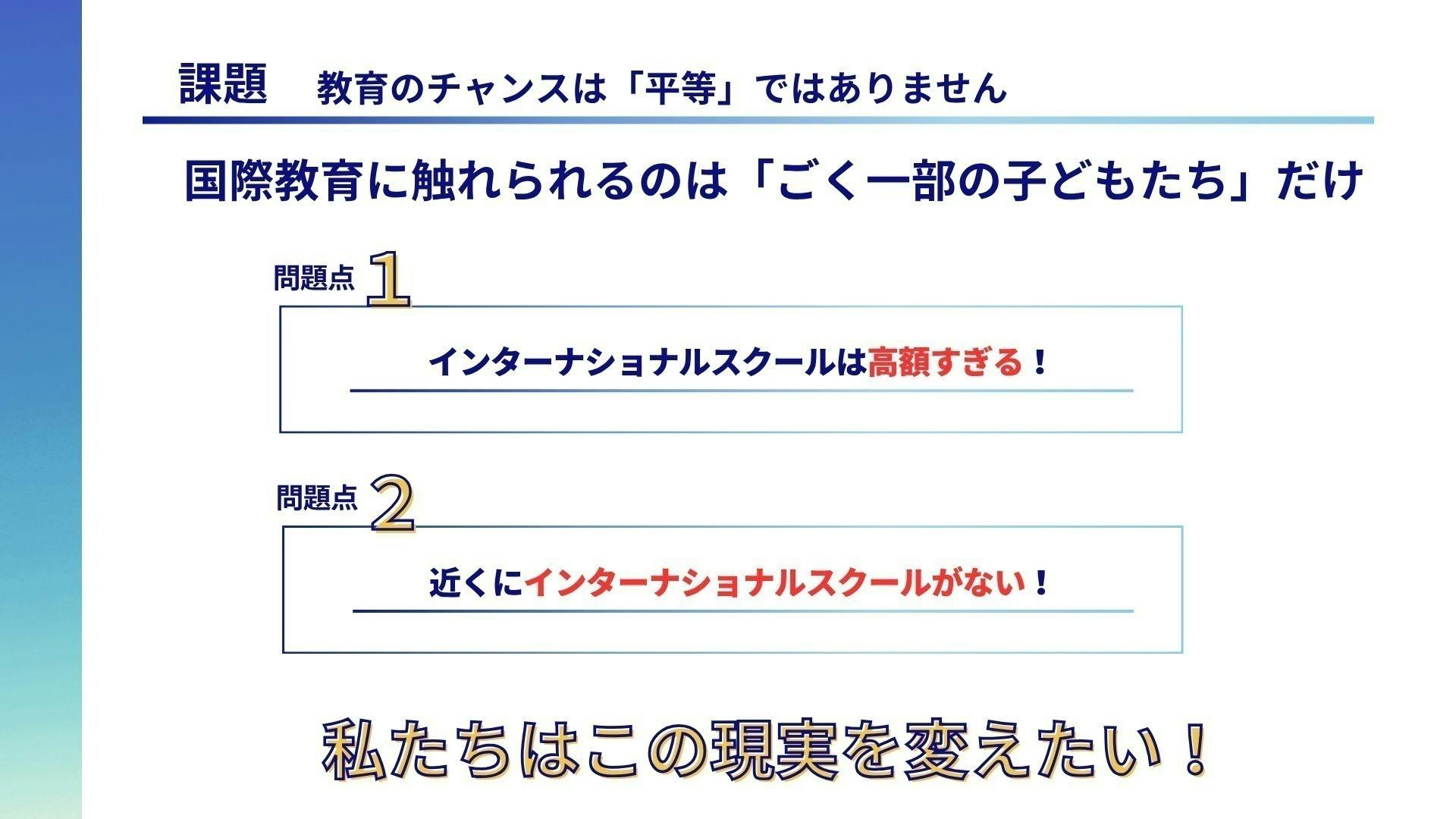 これにより、地方に住んでいても、経済的に厳しい状況にあっても、誰もが国際教育に参加できる仕組みを広げていきます。