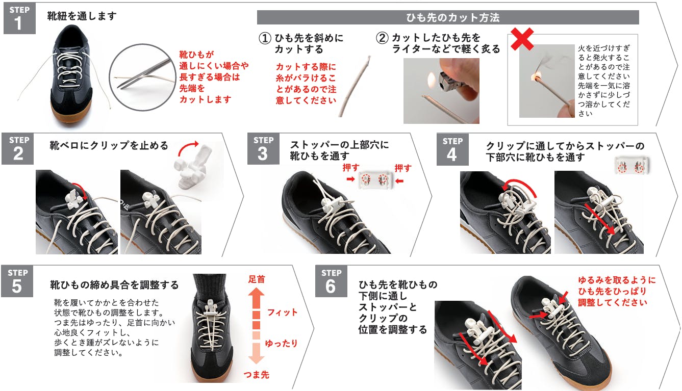 ストッパーとクリップでしっかり固定。面倒な結び直しや、靴ひものバラつきによる見た目の乱れを防ぎます。