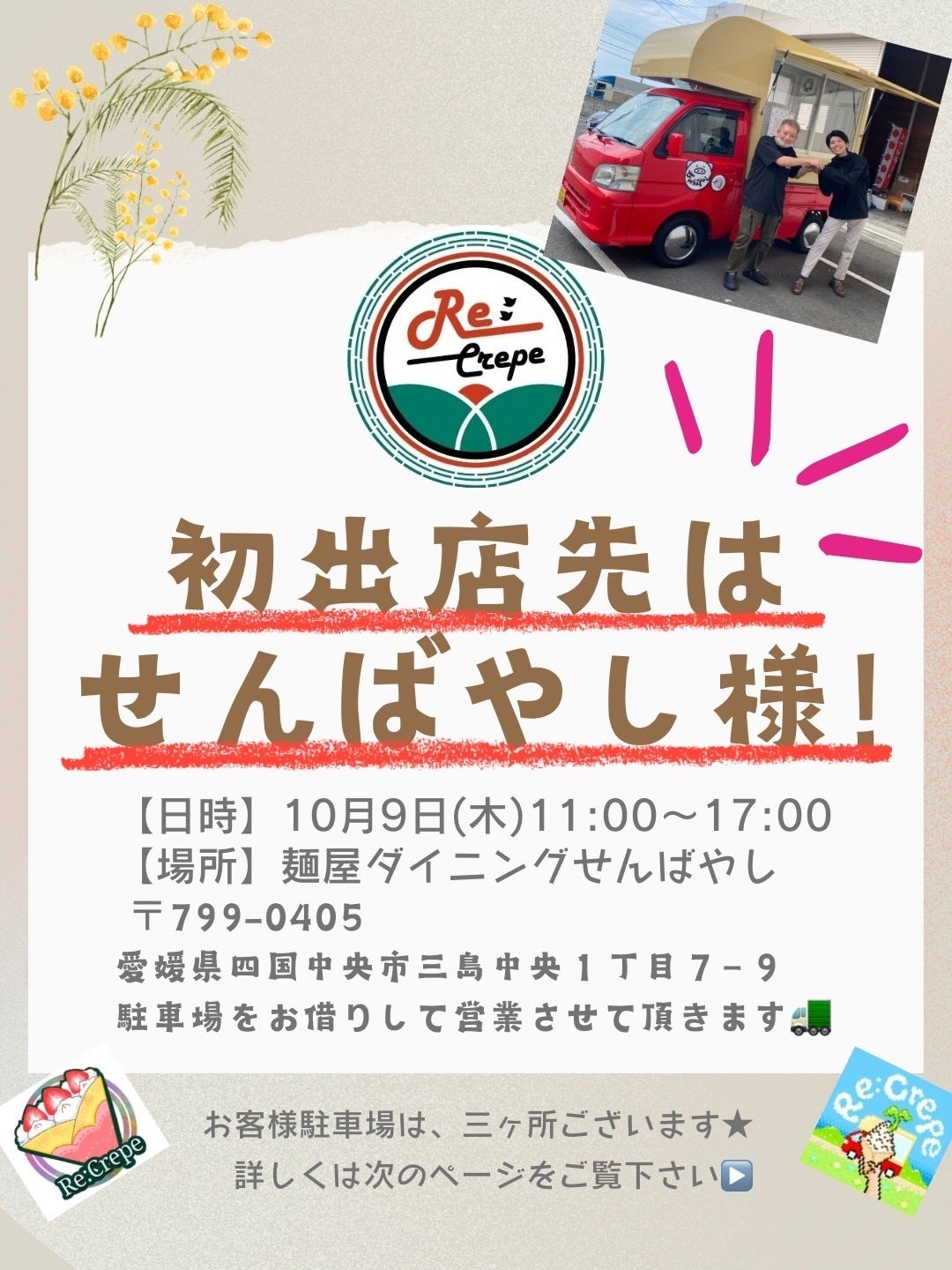 2025/10/08 13:59ご報告Re:Crepe(リ・クレープ)初出店は「麺屋ダイニング せんばやし」様にて、駐車場をお借りして販売させていただきます。日時:10月9日(木)営業時間:11:00〜17:00場所:麺屋ダイニング せんばやし住所:〒799-0405 愛媛県四国中央市三島中央1丁目7-9お客様駐車場は、店舗裏側・市営中央駐車場の2箇所ございます。――――――――――――――――――先日の火災でキッチンカーを失い、「もうクレープ屋を辞めようかな」と思っていました。そんな時、一番最初に声をかけてくださったのが『せんばやし』の原田さんご夫婦でした。大切にしていたキッチンカーを、「返済は余裕ができてからで良いからね」と譲ってくださり、その言葉がもう一度前を向く勇気をくださいました。そのお心遣いに、どれだけ救われたか分かりません。さらに、様々な業者の方や税理士の先生など多くの方を紹介してくださり、本当に何から何まで感謝してもしきれないほどお世話になりました。だからこそ、再出発の第一歩は原田さんご夫婦に一番最初のクレープを食べていただきたい。その想いを込めて、今回「麺屋ダイニング せんばやし」様で出店させていただくことになりました。ぜひクレープを食べた後は、「せんばやし」様で絶品の串カツやラーメンもお楽しみください。せんばやし様は18:00より営業されています。――――――――――――――――――たくさんの方々に支えられて、ようやくここまで戻ってくることができました。心からの「ありがとう」を込めて、また一歩ずつ、ここから前へ進んでいきます。 もっと見る